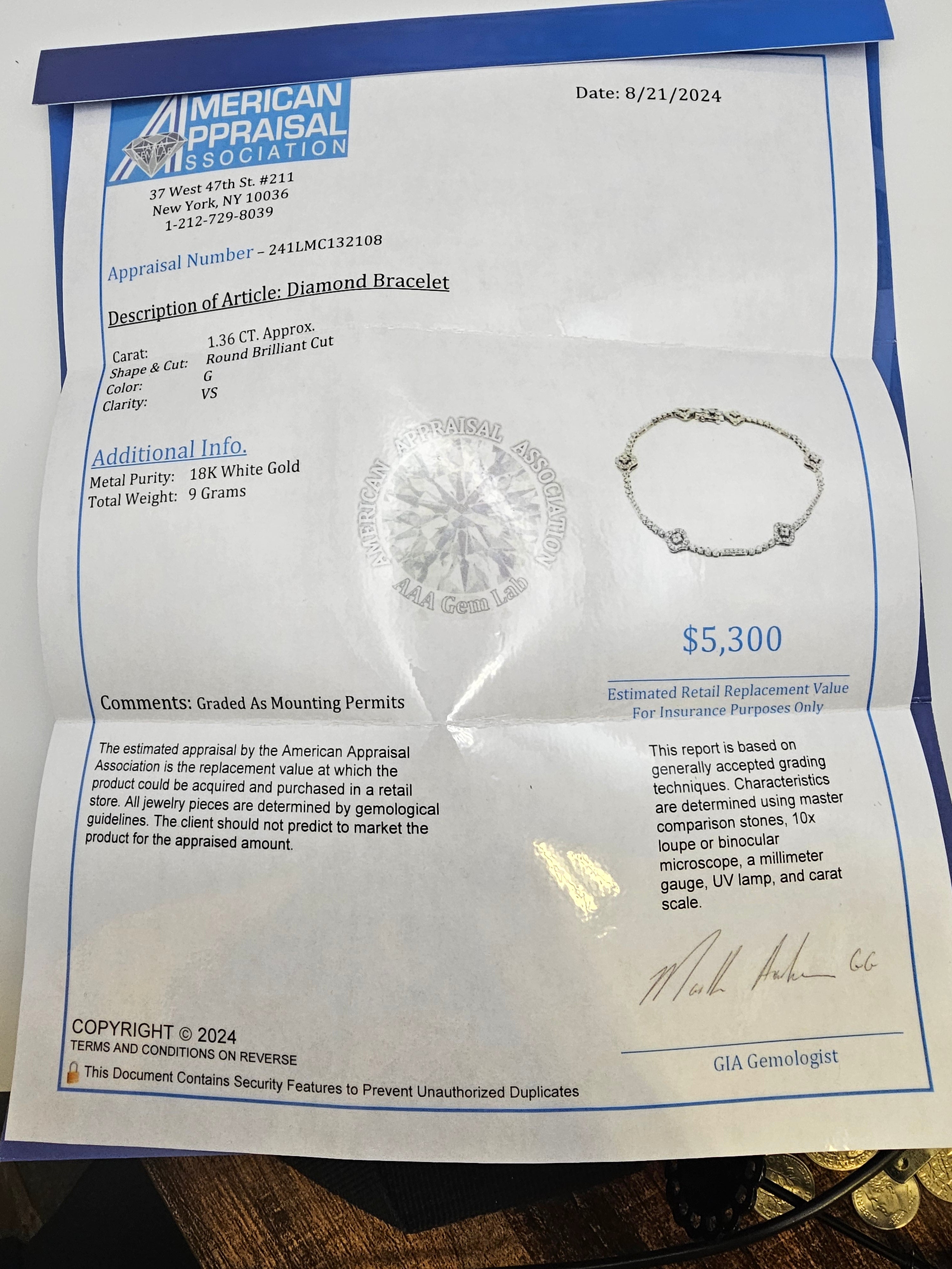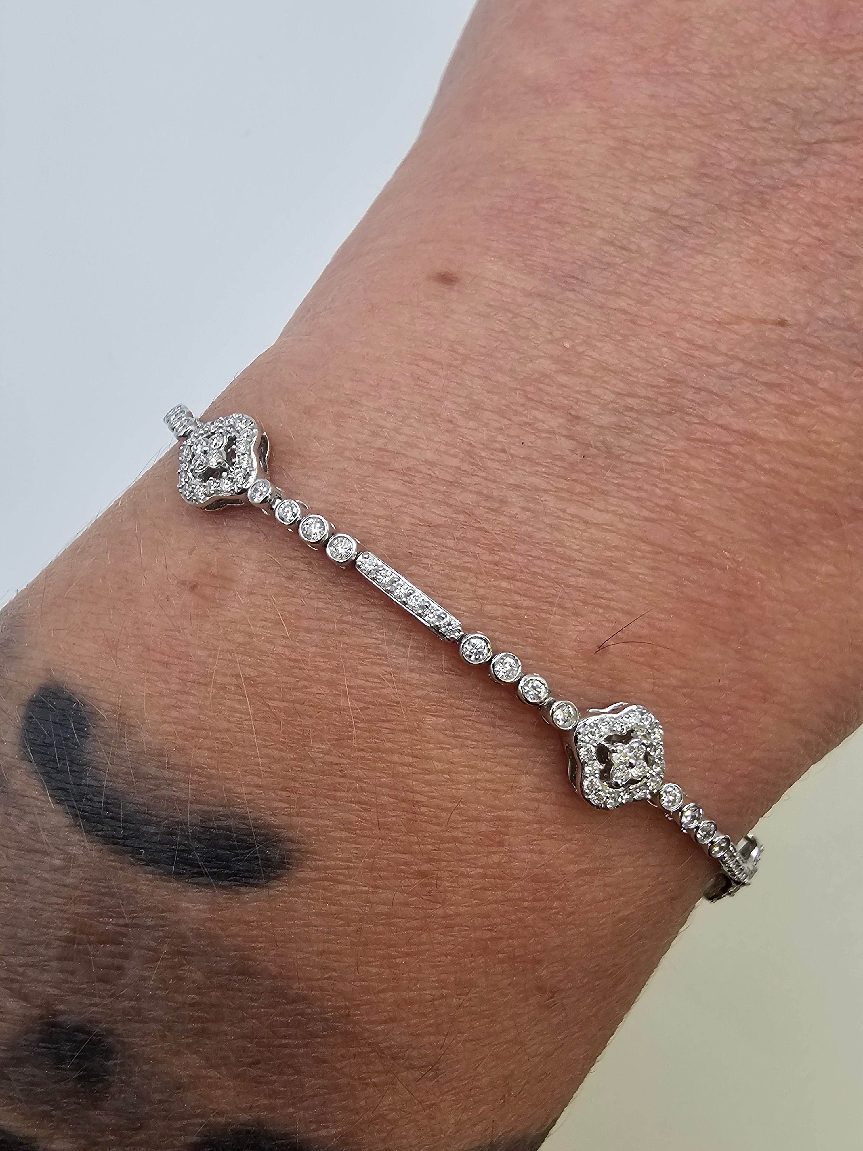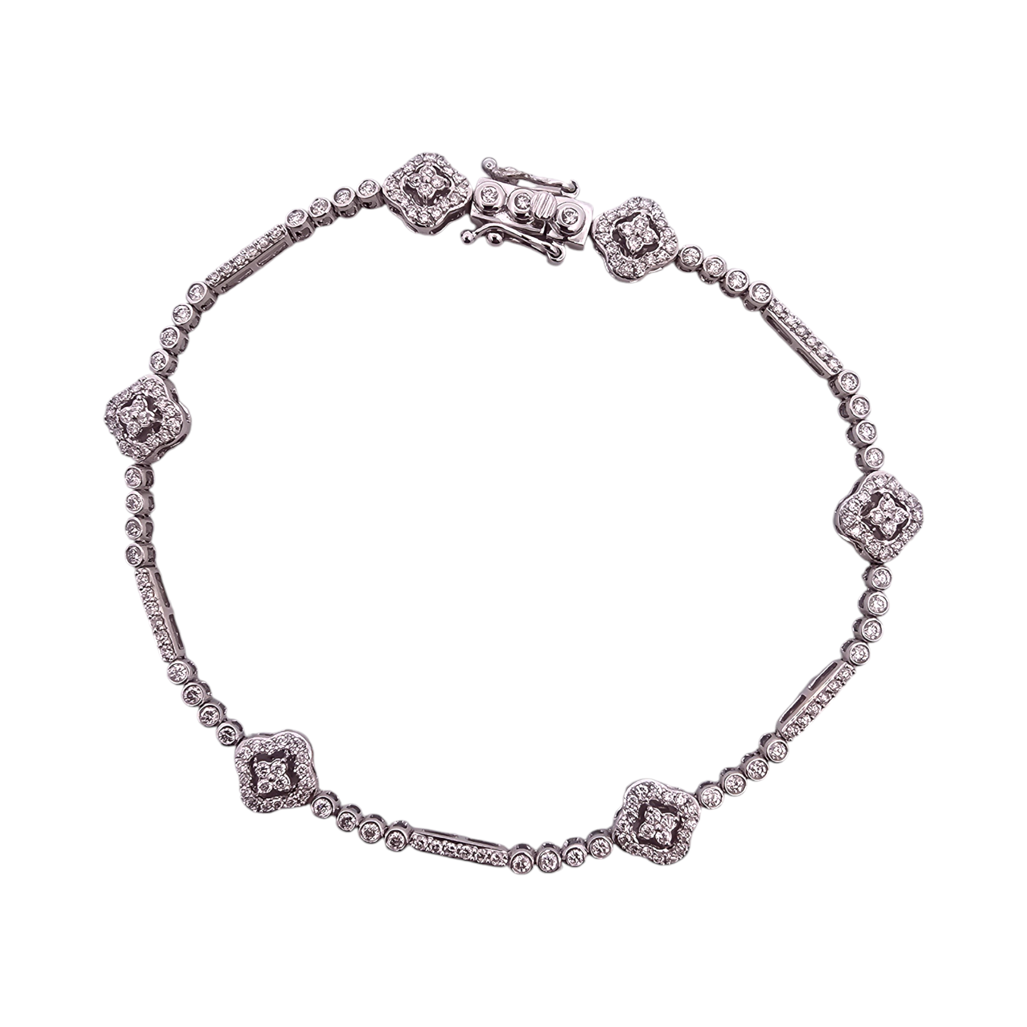 This exquisite 1.36 CTW Diamond Bracelet in 18k White Gold features a sophisticated tennis style with sparkling diamond cluster stations. Perfect for a special occasion or an elegant everyday look, this bracelet is designed to dazzle and impress.
