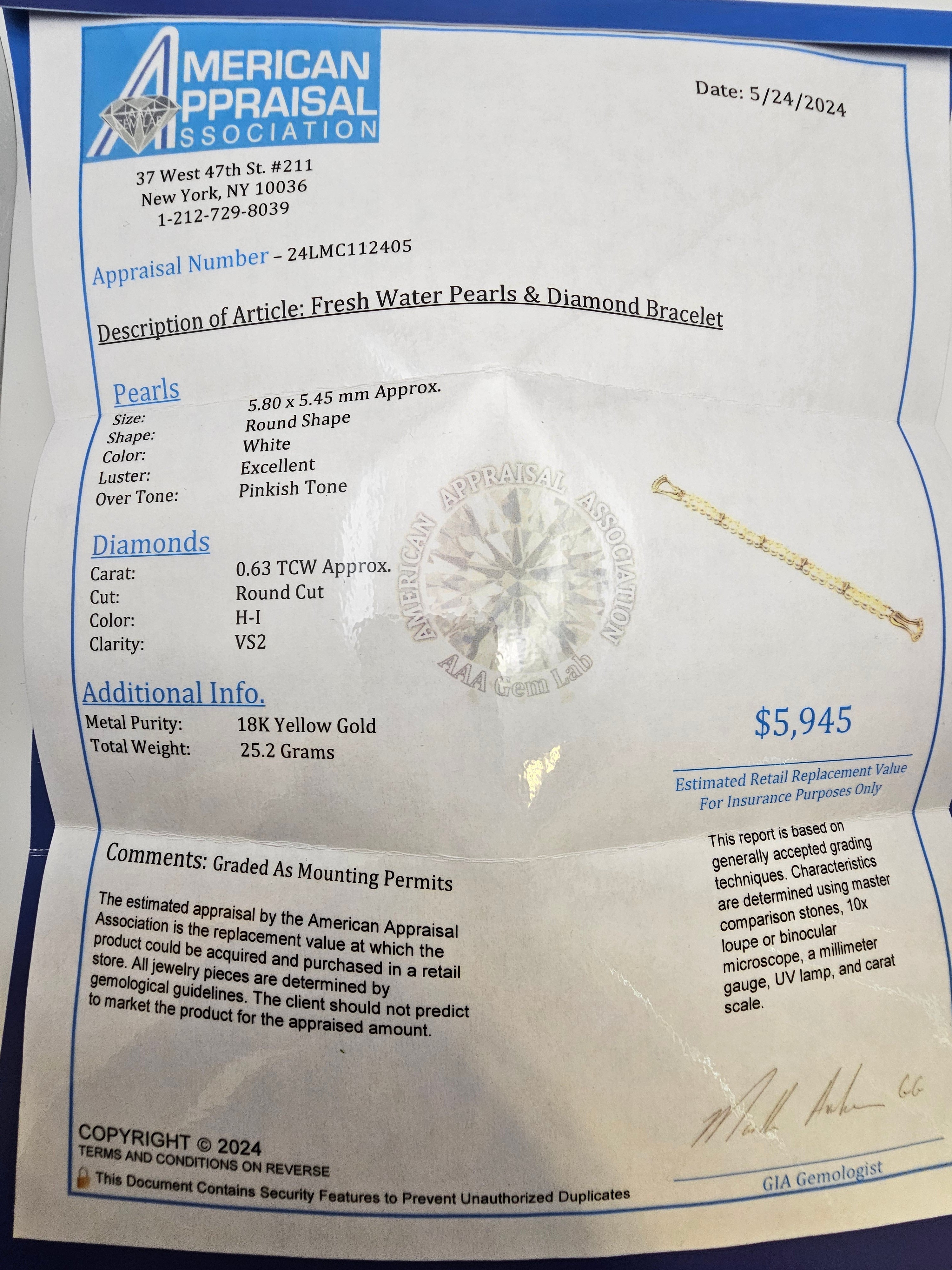 Fresh Water Pearl and Diamond Bracelet in 18k Yellow Gold