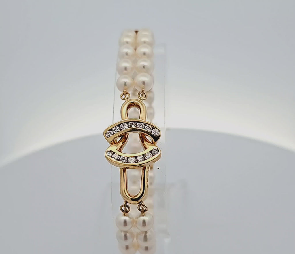 This elegant and sophisticated Fresh Water Pearl and Diamond Bracelet from the Westgate Jewelers Estate Collection is a true statement piece. Featuring a beautiful double-stranded design and toggle style clasp, it exudes luxury with its 18k yellow gold setting. The addition of channel set diamond accents adds a touch of sparkle and glamour to this timeless accessory.