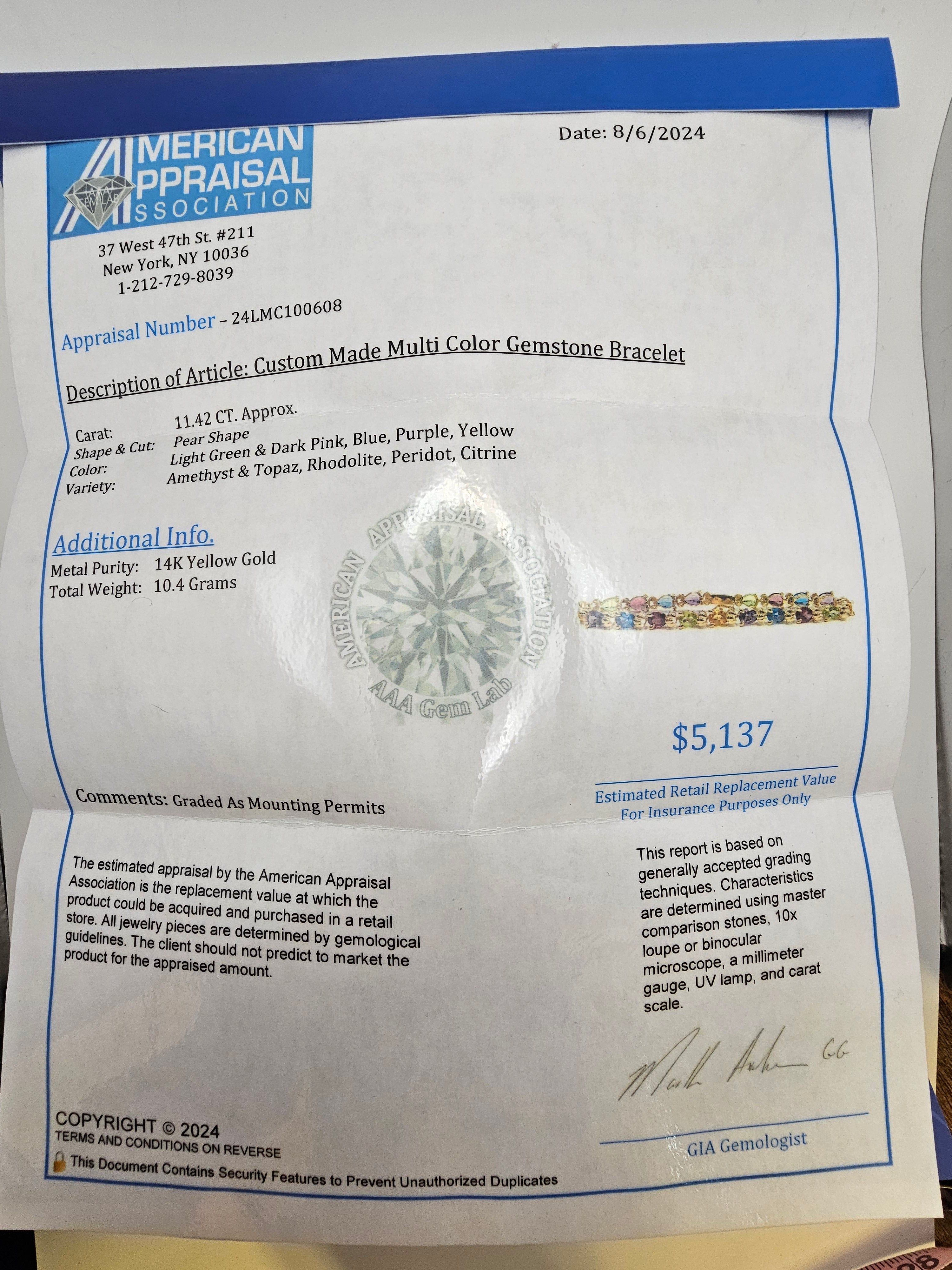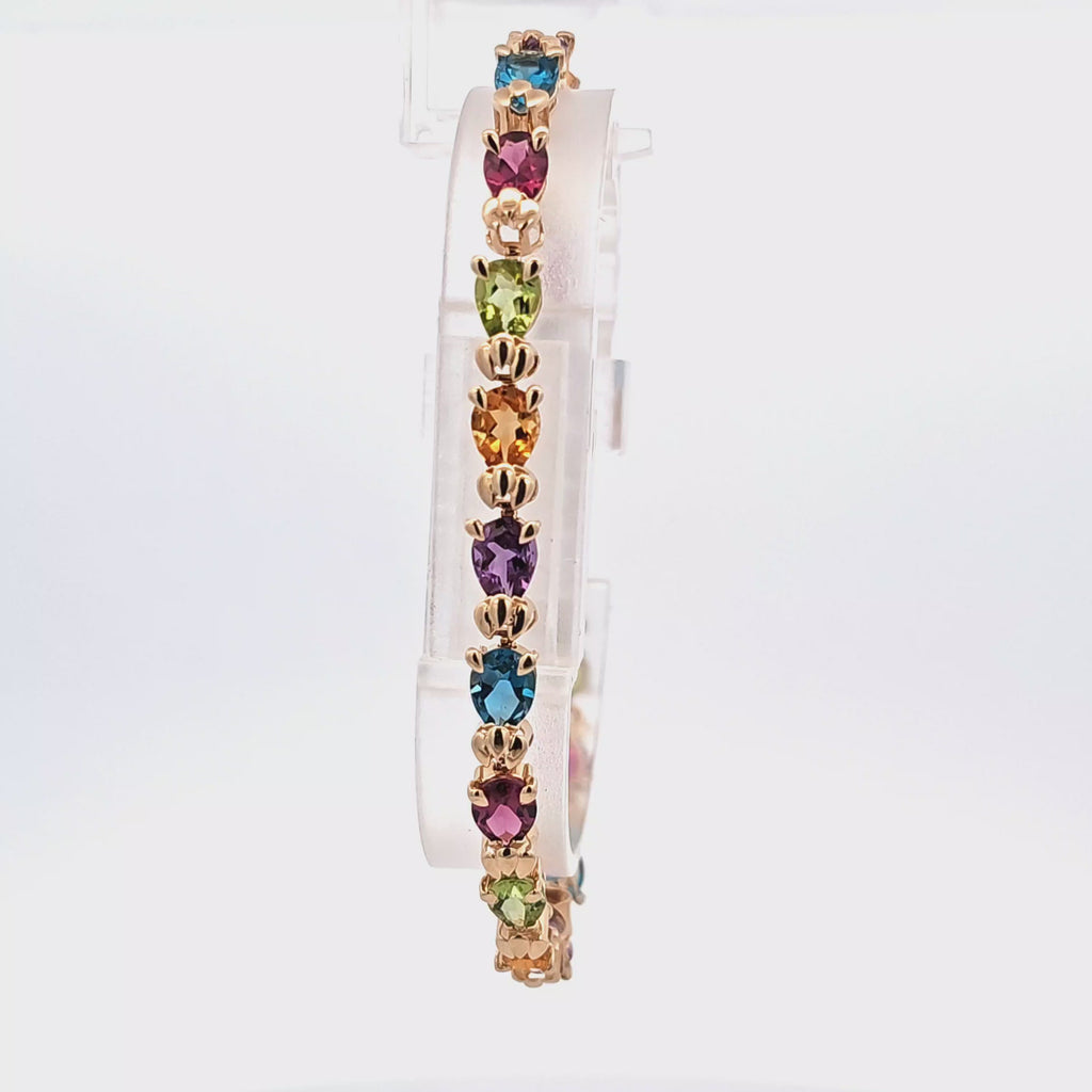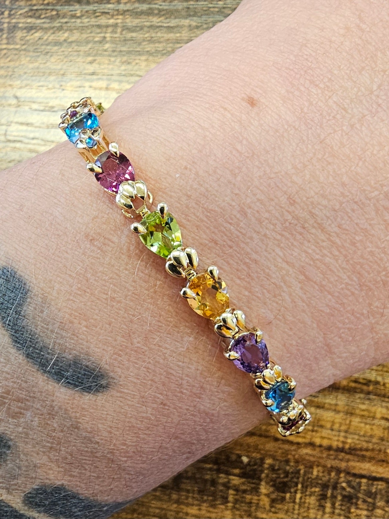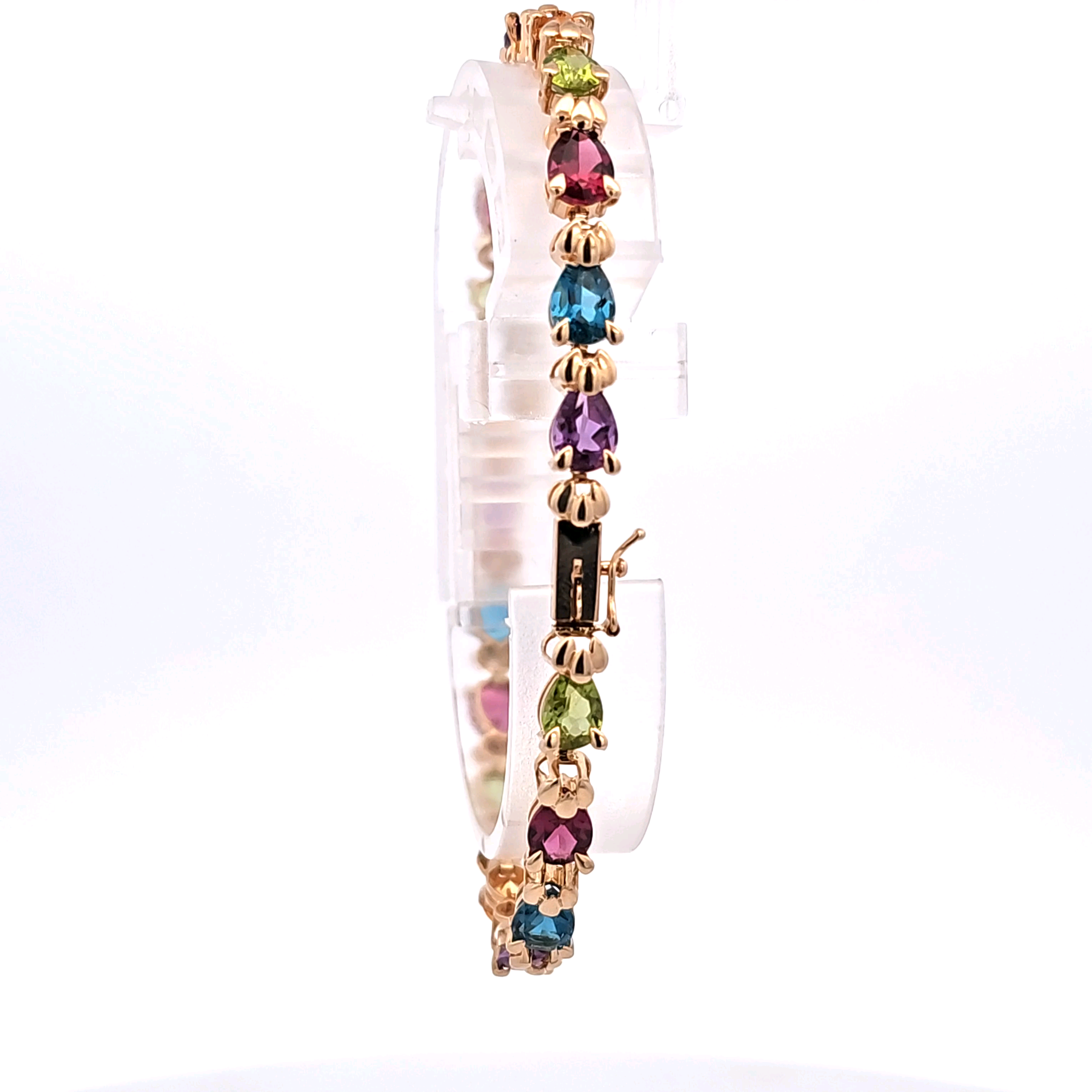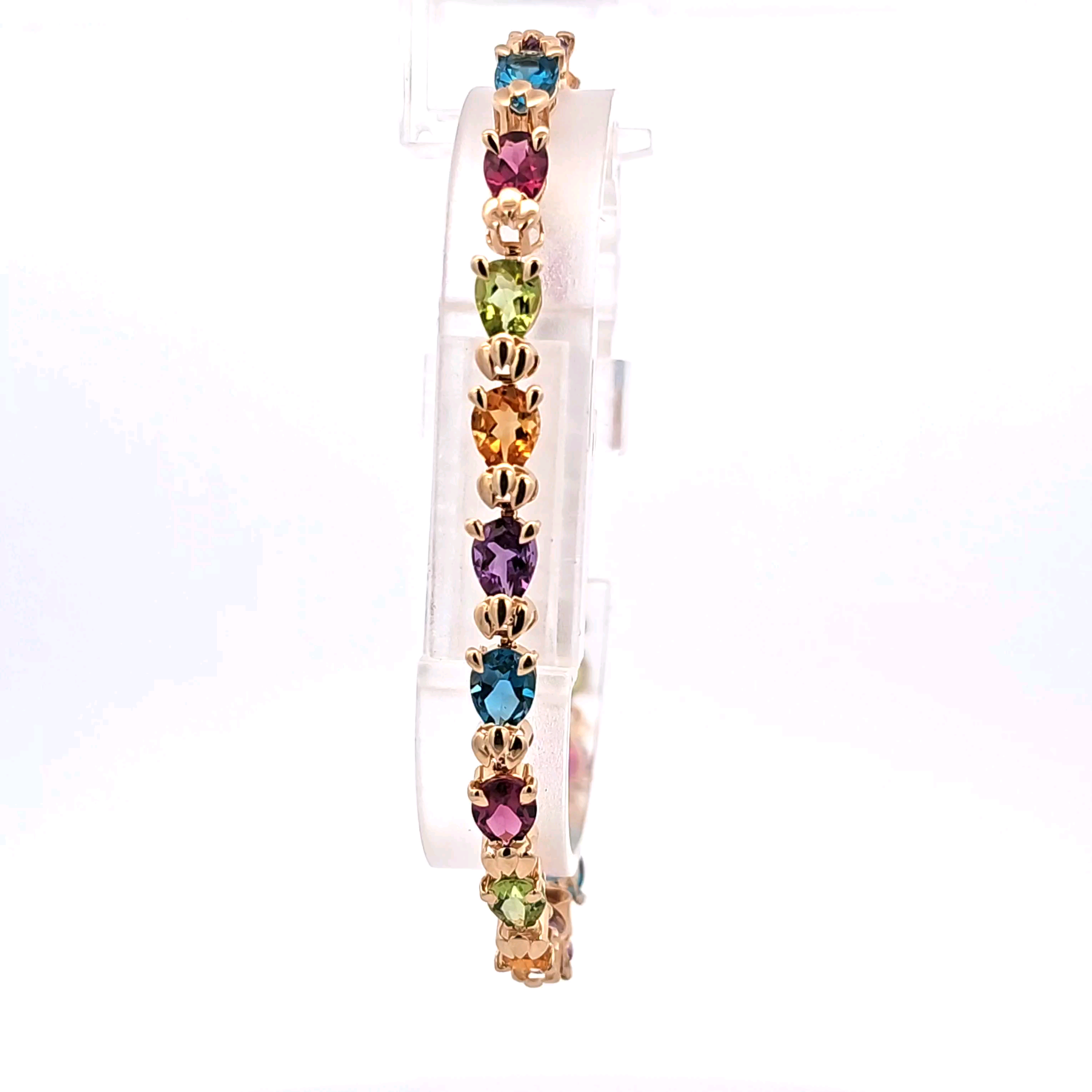 From the Westgate Jewelers Estate Collection, this exquisite tennis-style bracelet showcases an enchanting array of Pear cut gemstones, including rhodolite, blue topaz, amethyst, peridot, and citrine, set in 14k yellow gold. The vibrant colors and elegant design make this bracelet a standout piece.