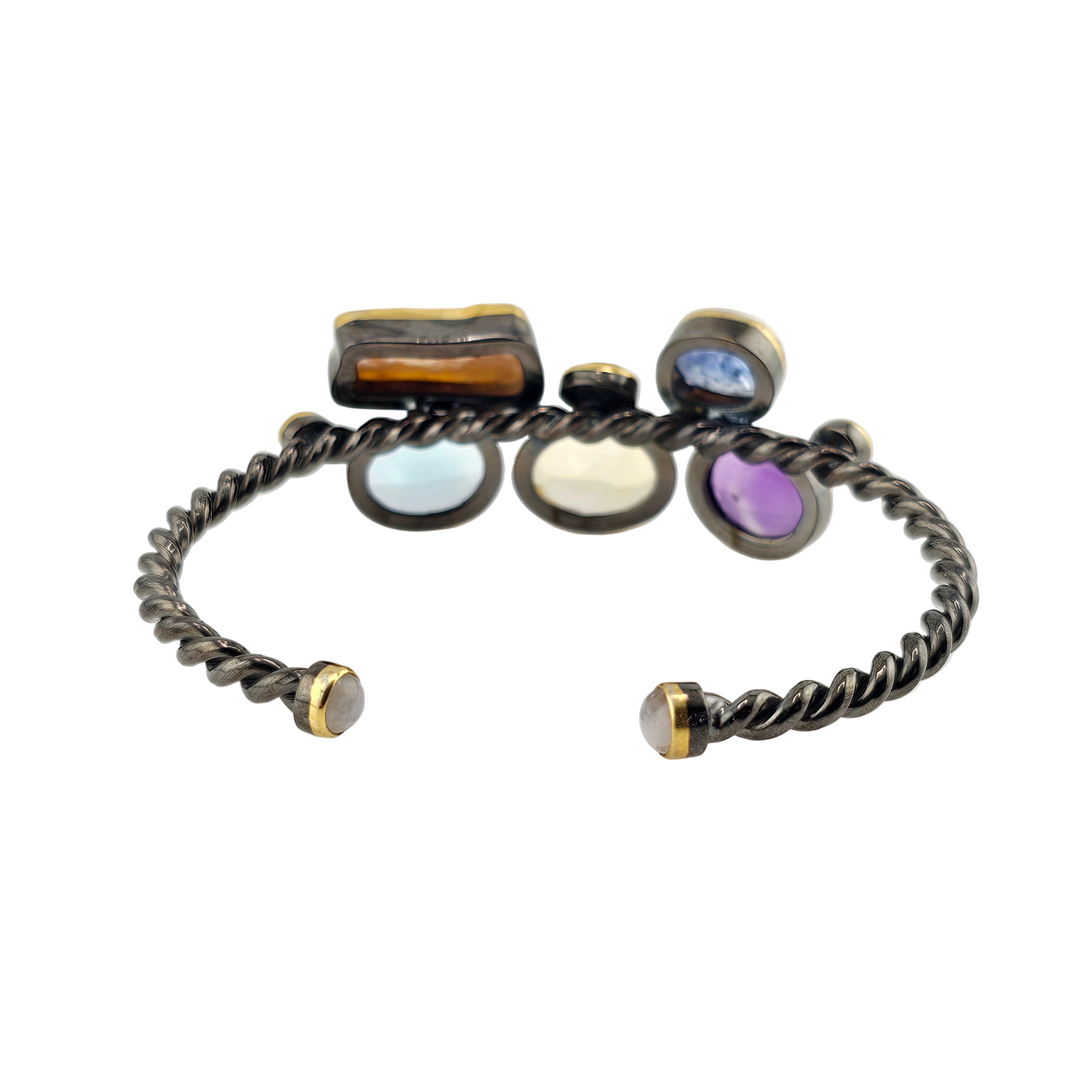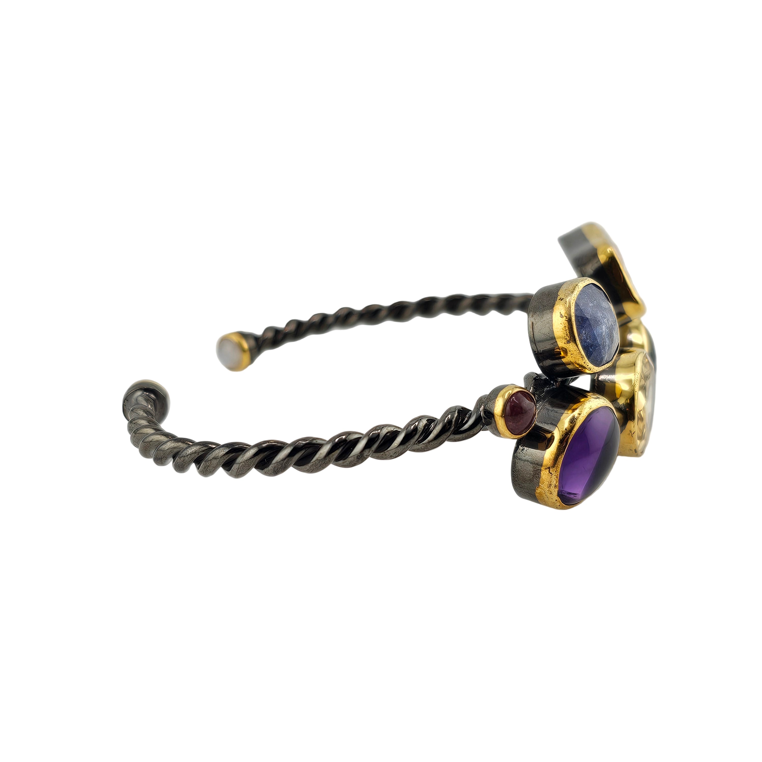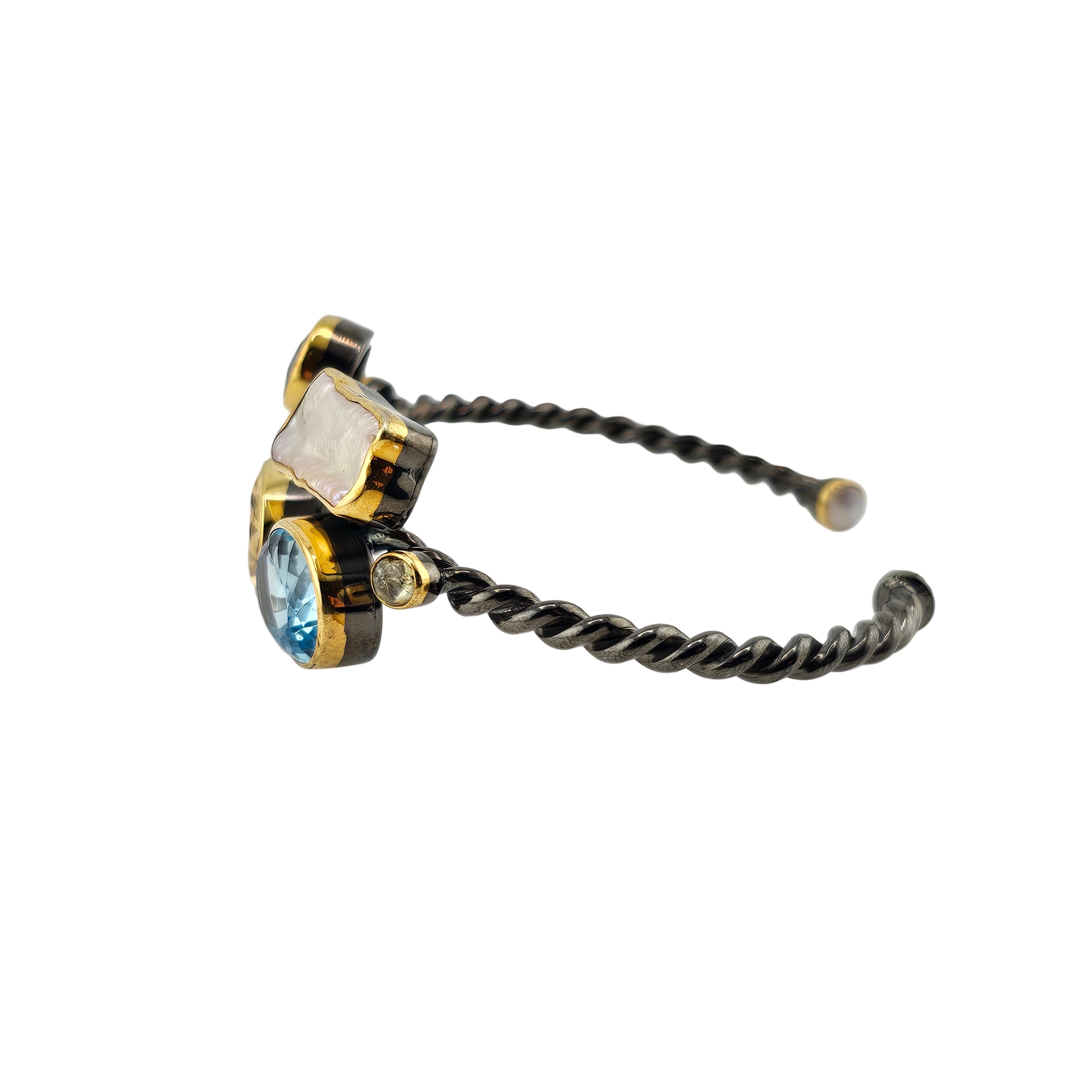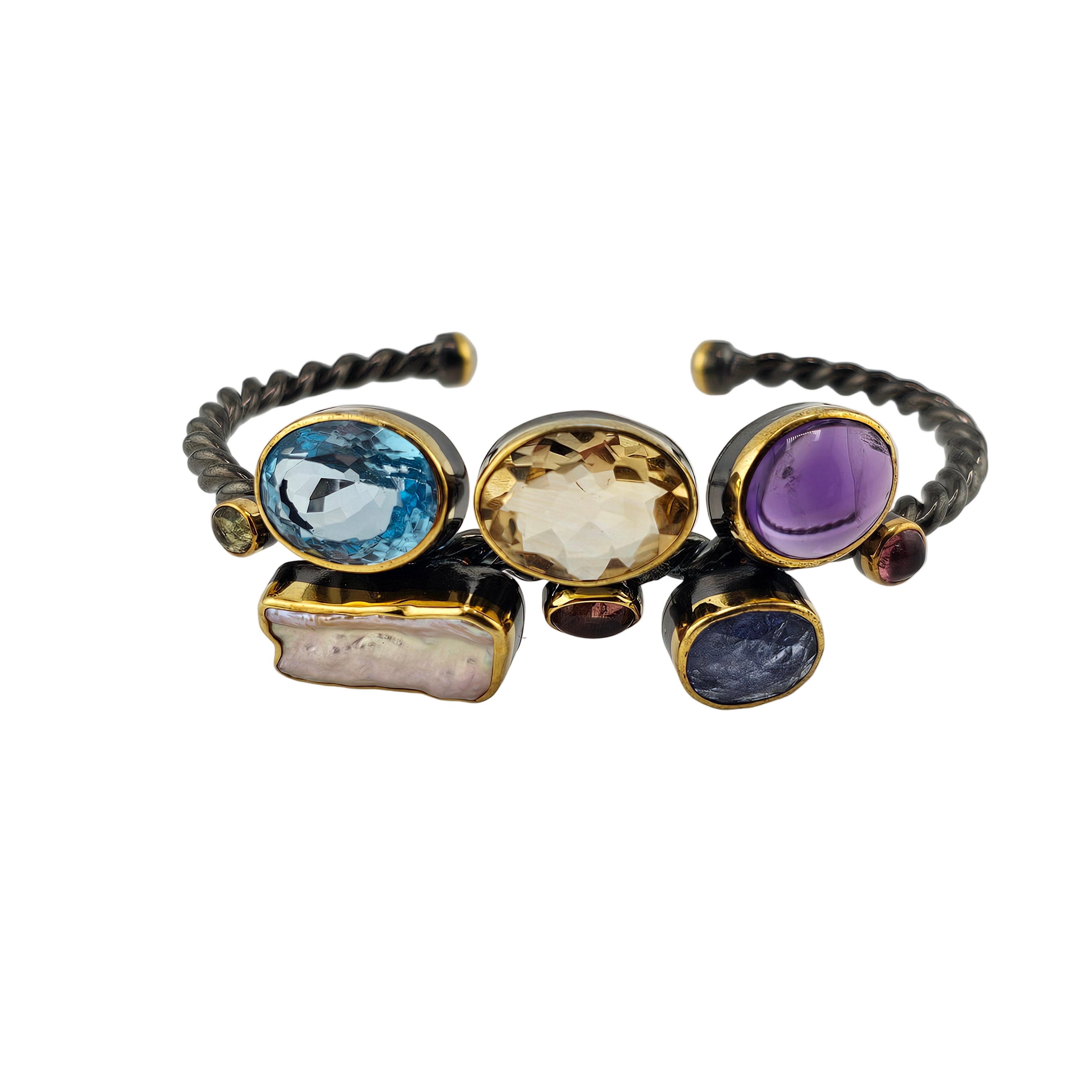 eless elegance meets captivating sparkle. Adorned with a mesmerizing cluster of bezel-set gemstones—pearl, tourmaline, tanzanite, amethyst, citrine, and blue topaz—each stone catches the light with its own enchanting glow. The luxurious gold vermeil accents and sophisticated black rhodium finish add depth and mystery to this wearable treasure. A statement piece that whispers of magic and wonder with every wear.