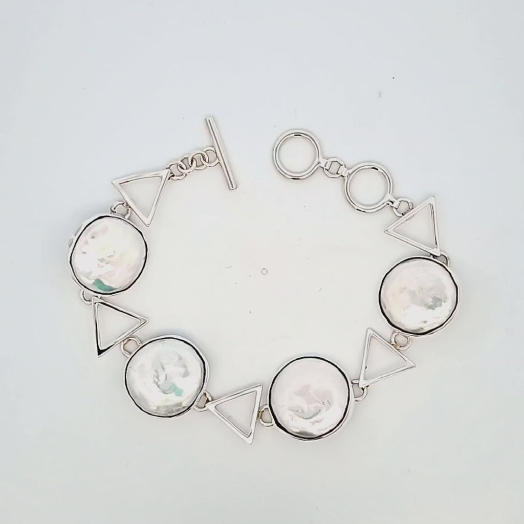 Get ready to add some unique flair to your jewelry collection with this Sterling Silver Geometric Coin Pearl Station Bracelet! Artisan Designed with genuine pearls and sterling silver, this bracelet features a playful Triangular link design with bezel-set Coin pearls for a touch of elegance. Stand out from the crowd with this one-of-a-kind bracelet!