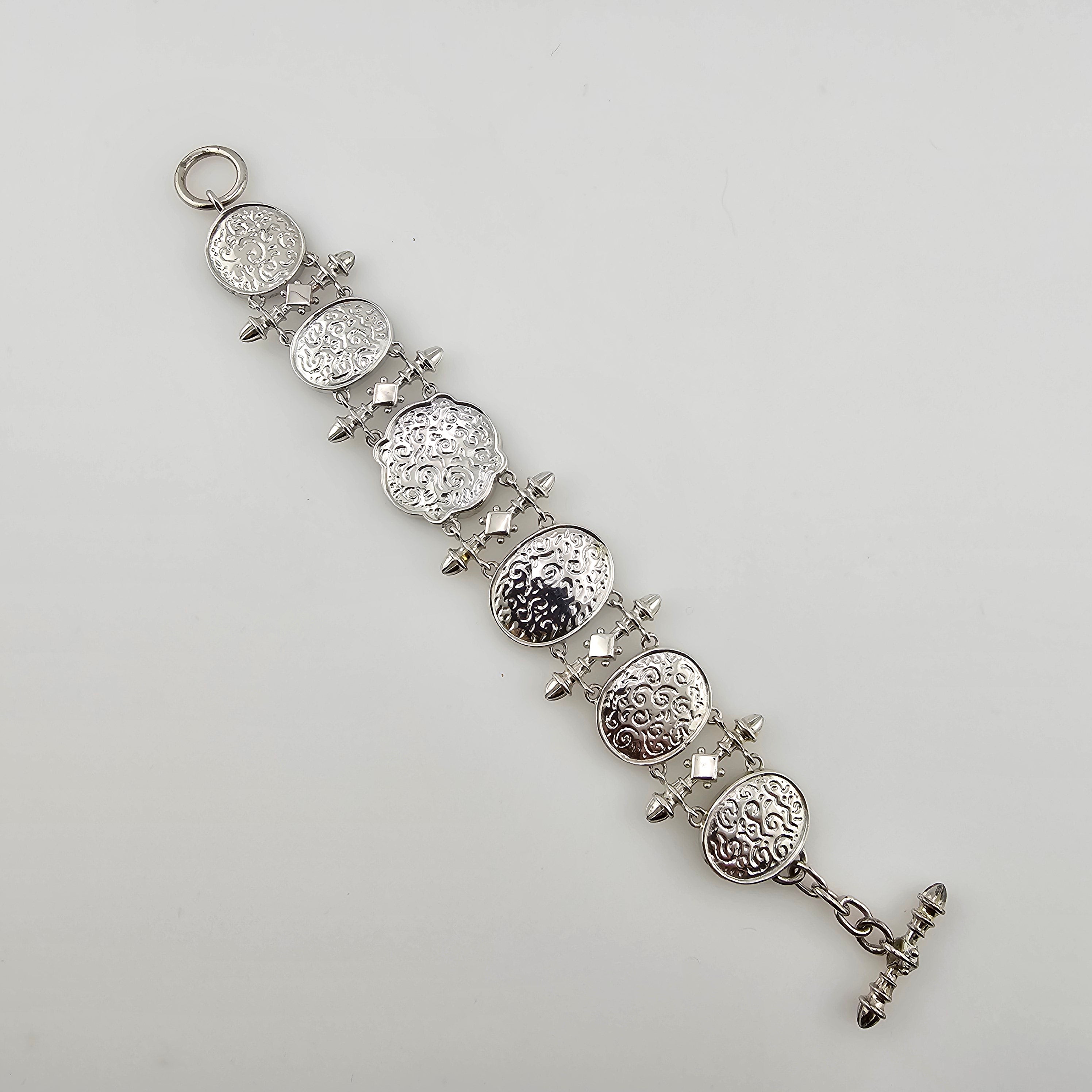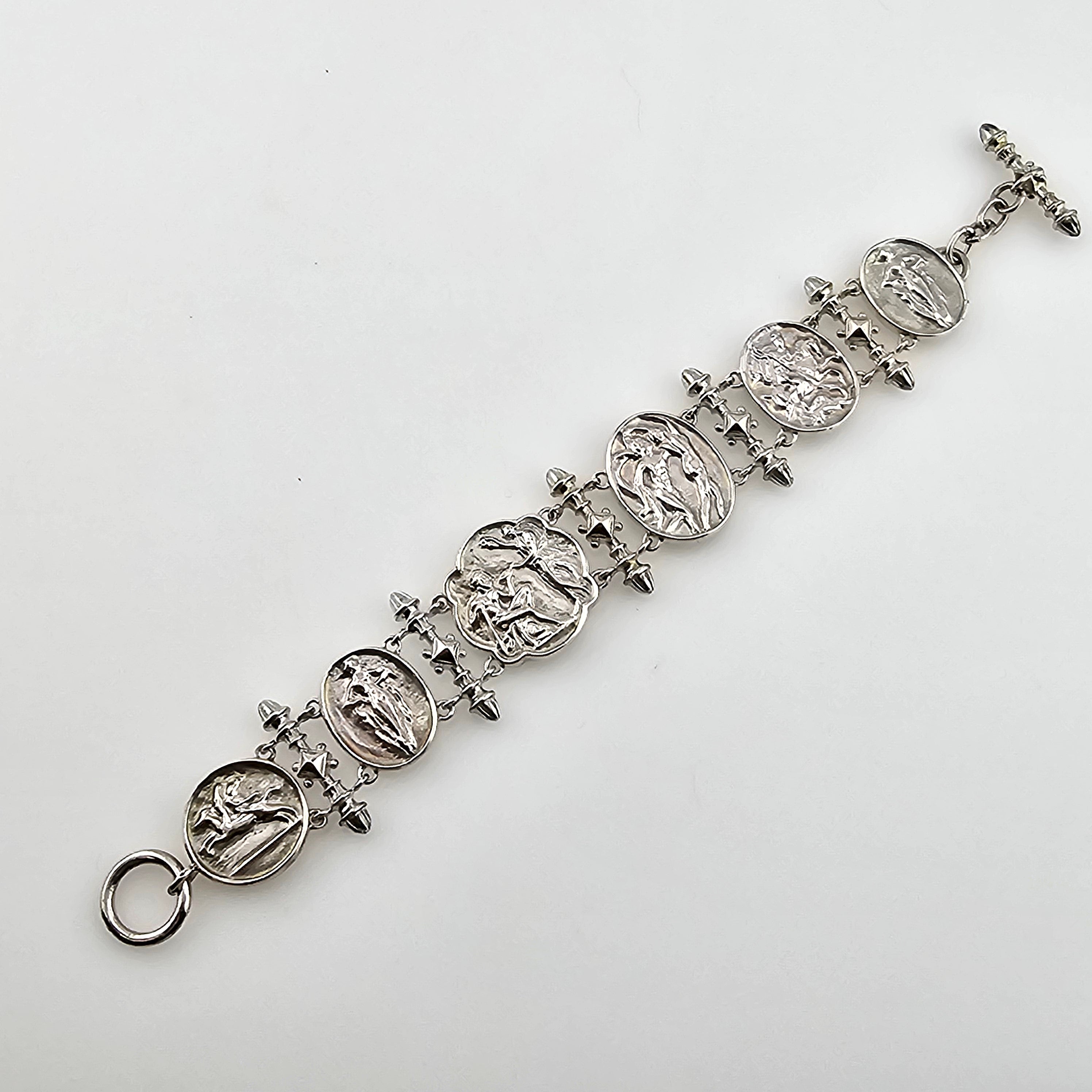 Experience the allure of ancient Greece with this Sterling Silver Greek Scenic Relief Panel Bracelet from Westgate Jewelers Estate collection. Each oval panel is intricately crafted to reveal timeless scenes of warriors, gods, and goddesses, capturing the spirit of Grecian art. The elegant toggle clasp adds a classic touch, making this bracelet a captivating treasure that weaves history and enchantment effortlessly onto your wrist.