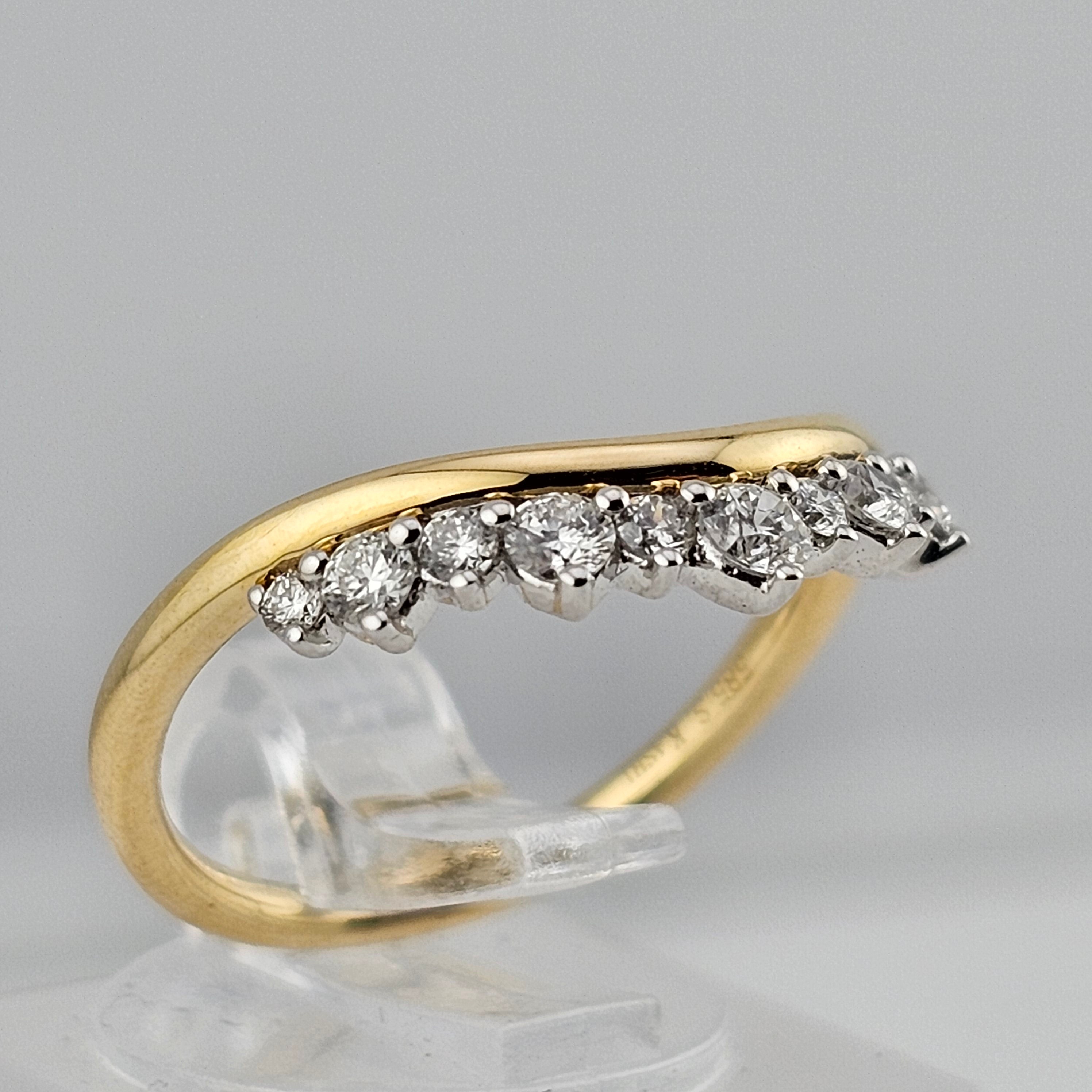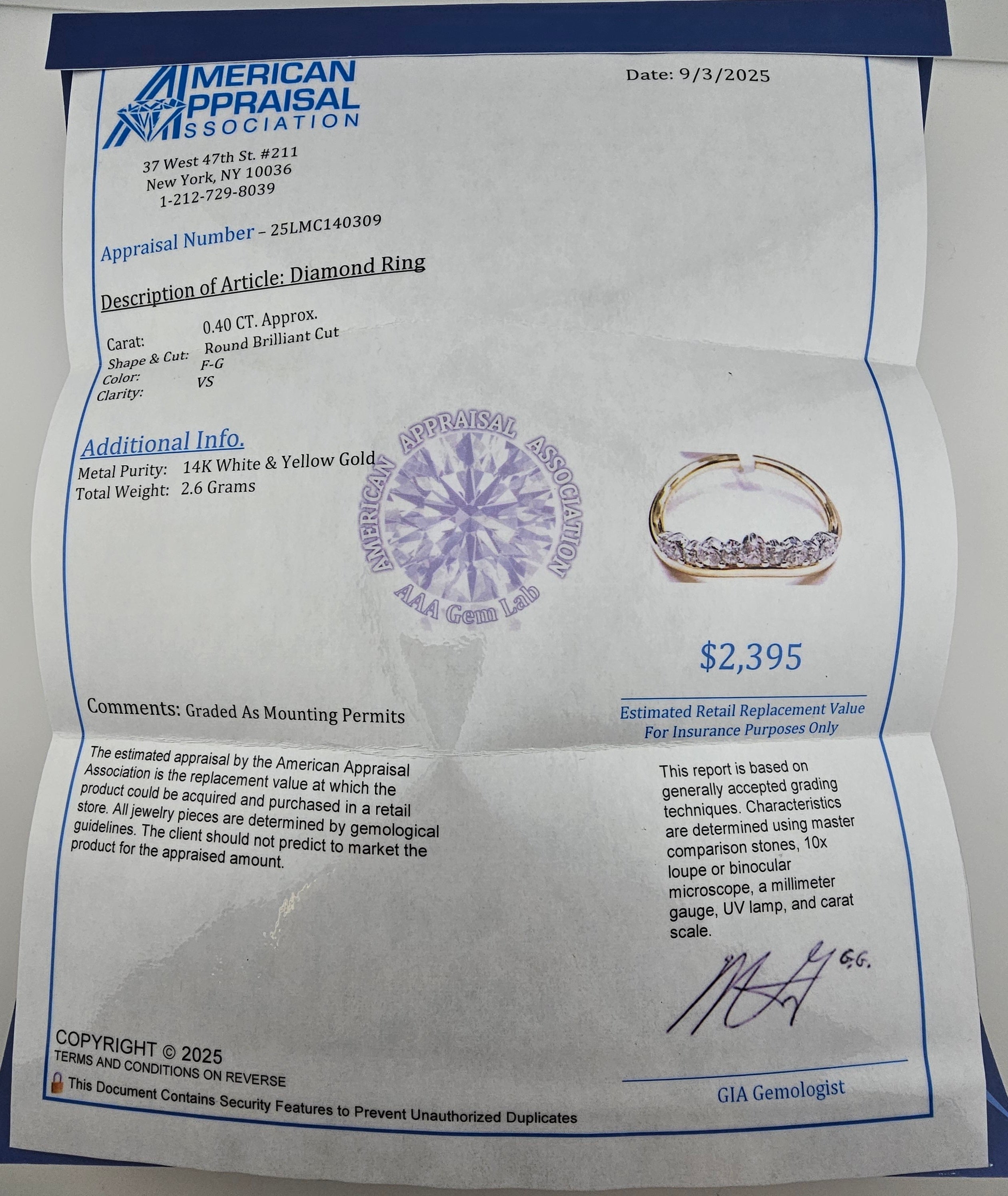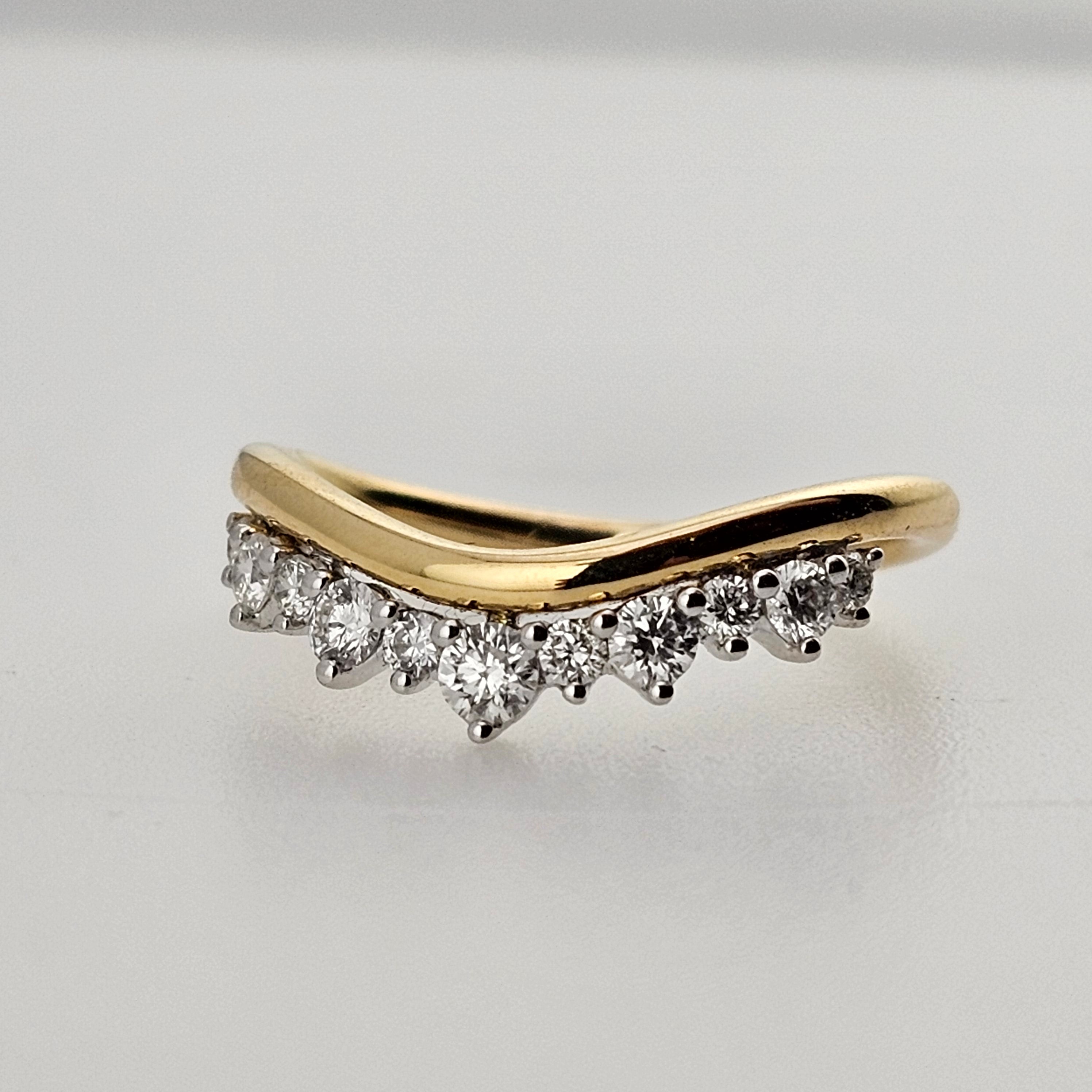 This 0.40 CTW diamond wedding band in 14k yellow gold is subtly arched to embrace the graceful curve of your engagement ring. Its gentle arc creates a harmonious dance of light, weaving a touch of enchantment into every glance. This band adds a magical sparkle to your story of love.