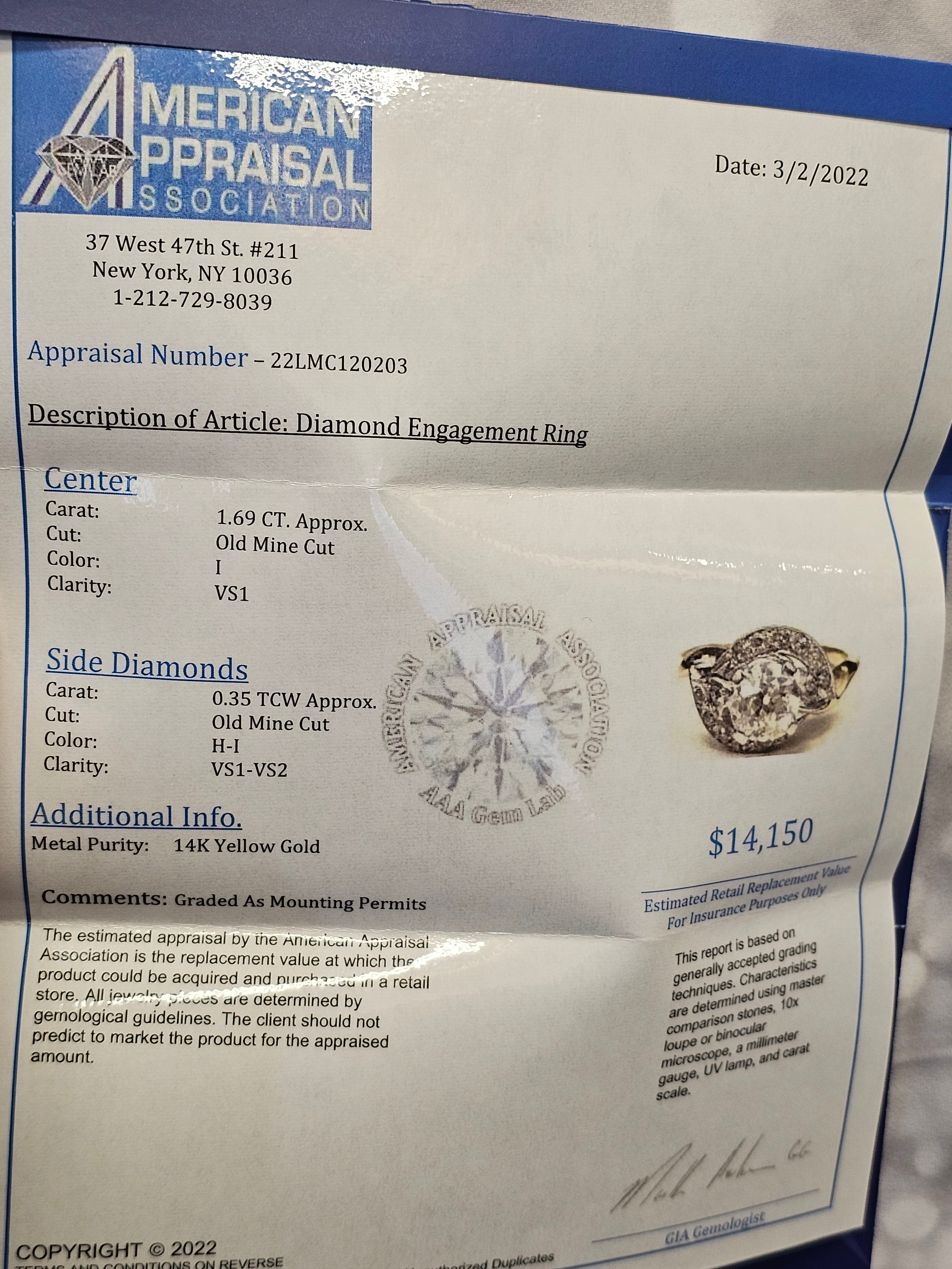 This stunning 14k yellow gold engagement ring from the Westgate Jewelers Estate Collection features a phenomenal 1.69ct Old Mine Cut diamond with an additional 0.35 CTW of accent diamonds. A vintage ring that exudes luxury and is sure to impress.