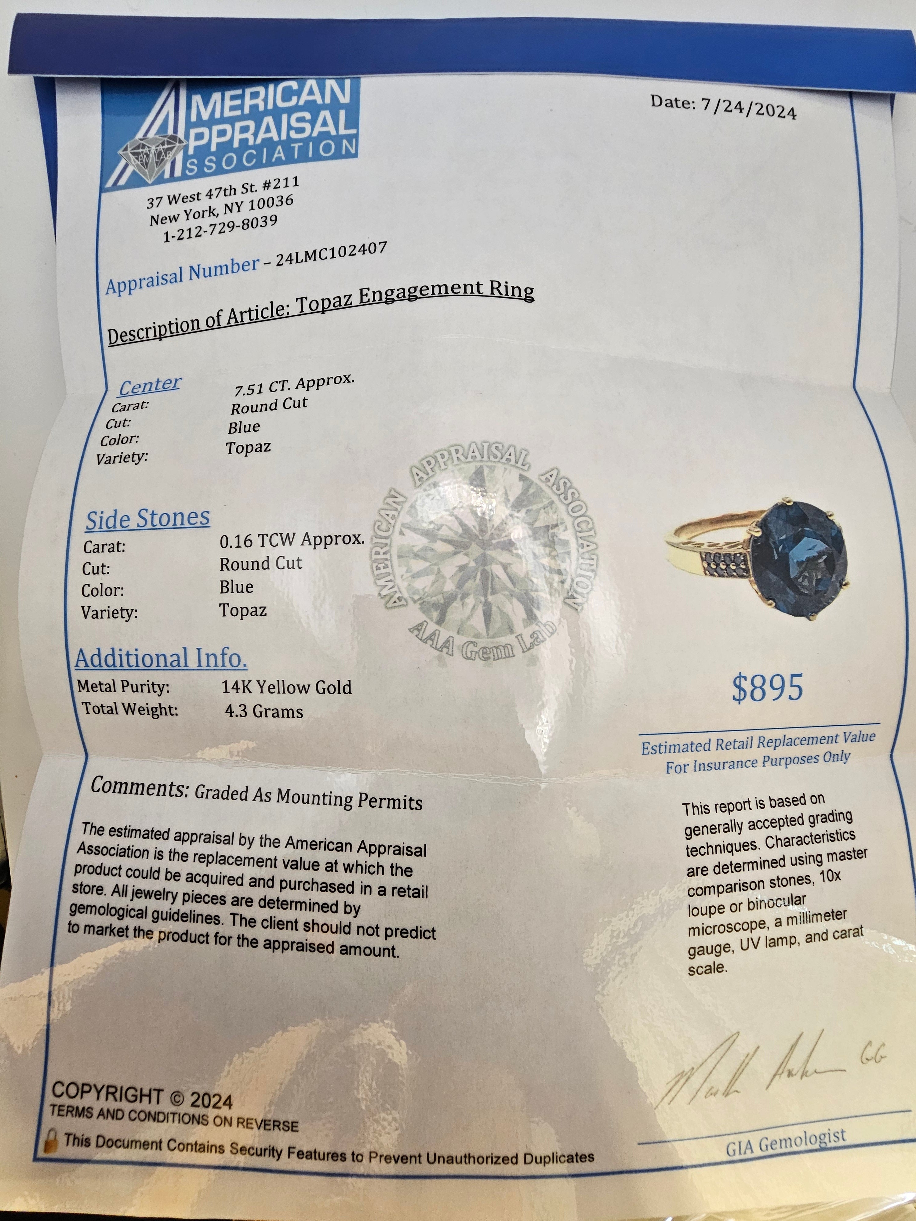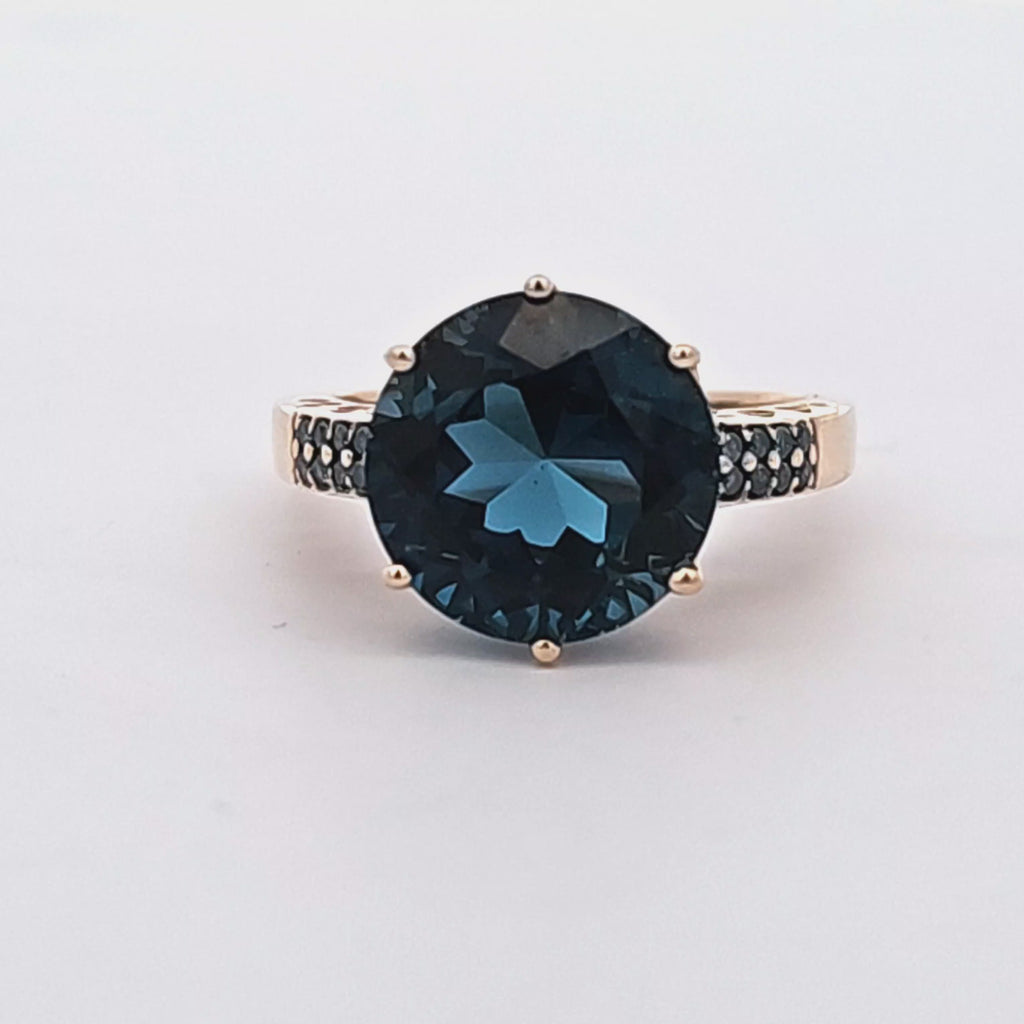 - Gemstones: 7.51 Carat Round Cut Blue Topaz Center Stone, 0.16 Carat Round Cut Blue Topaz Accents