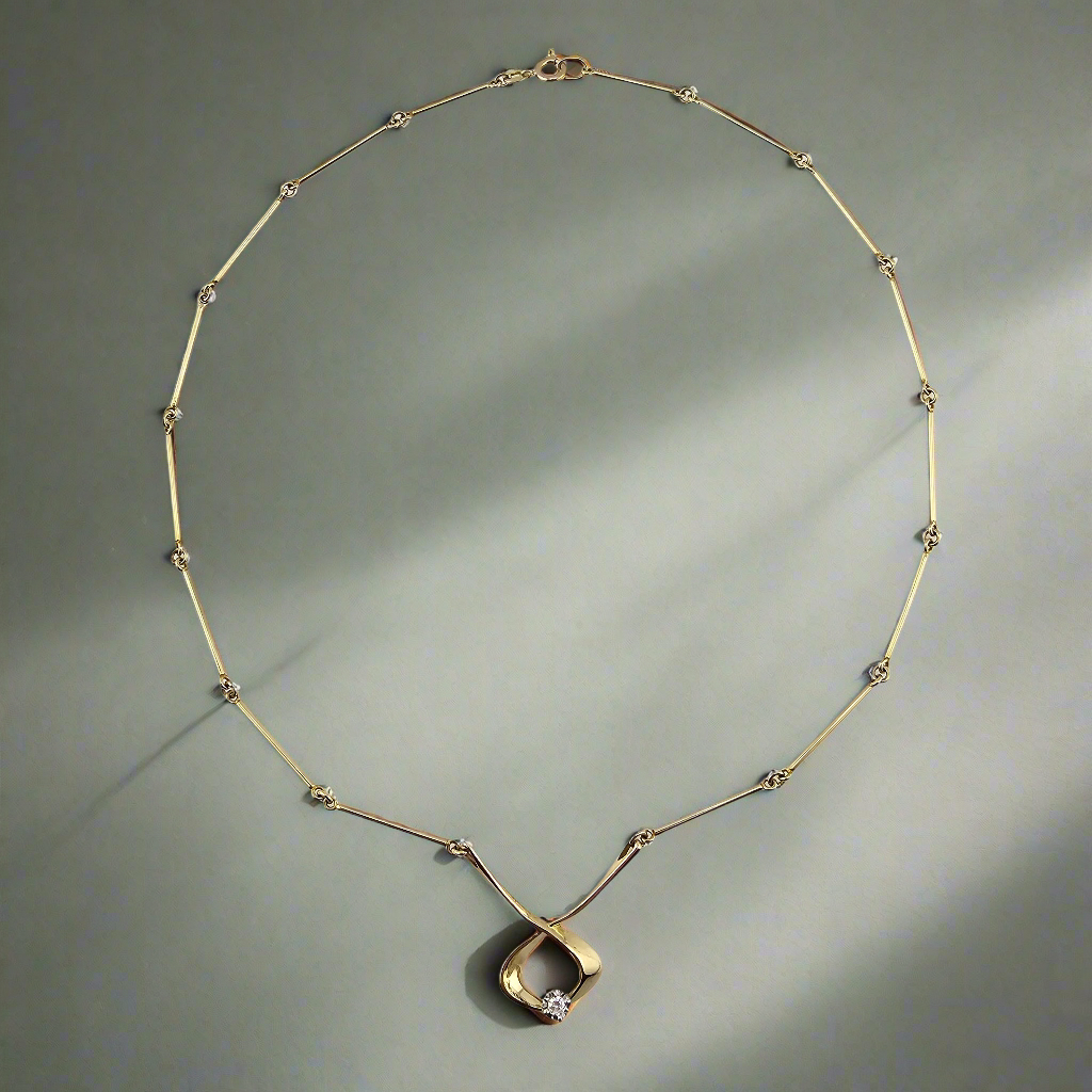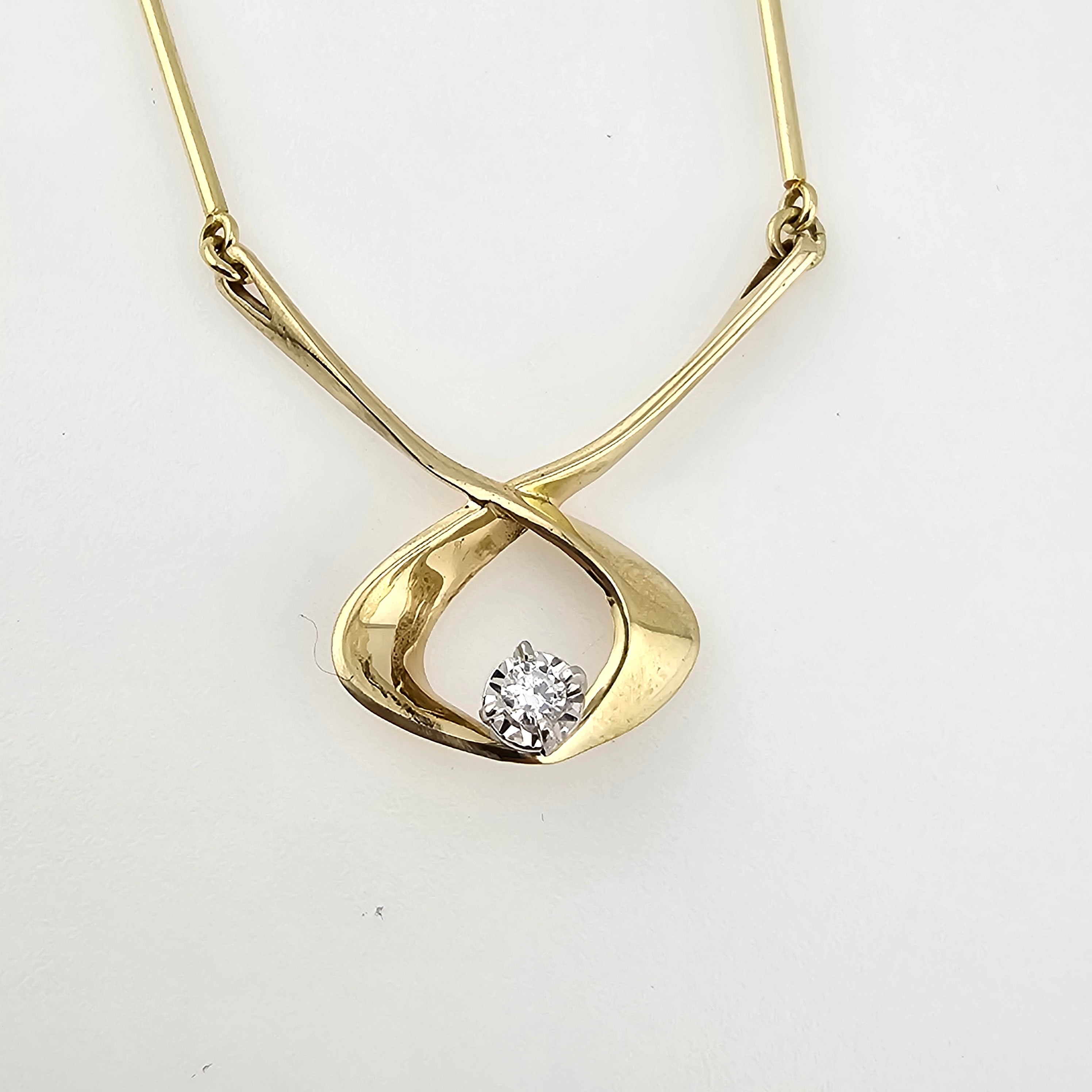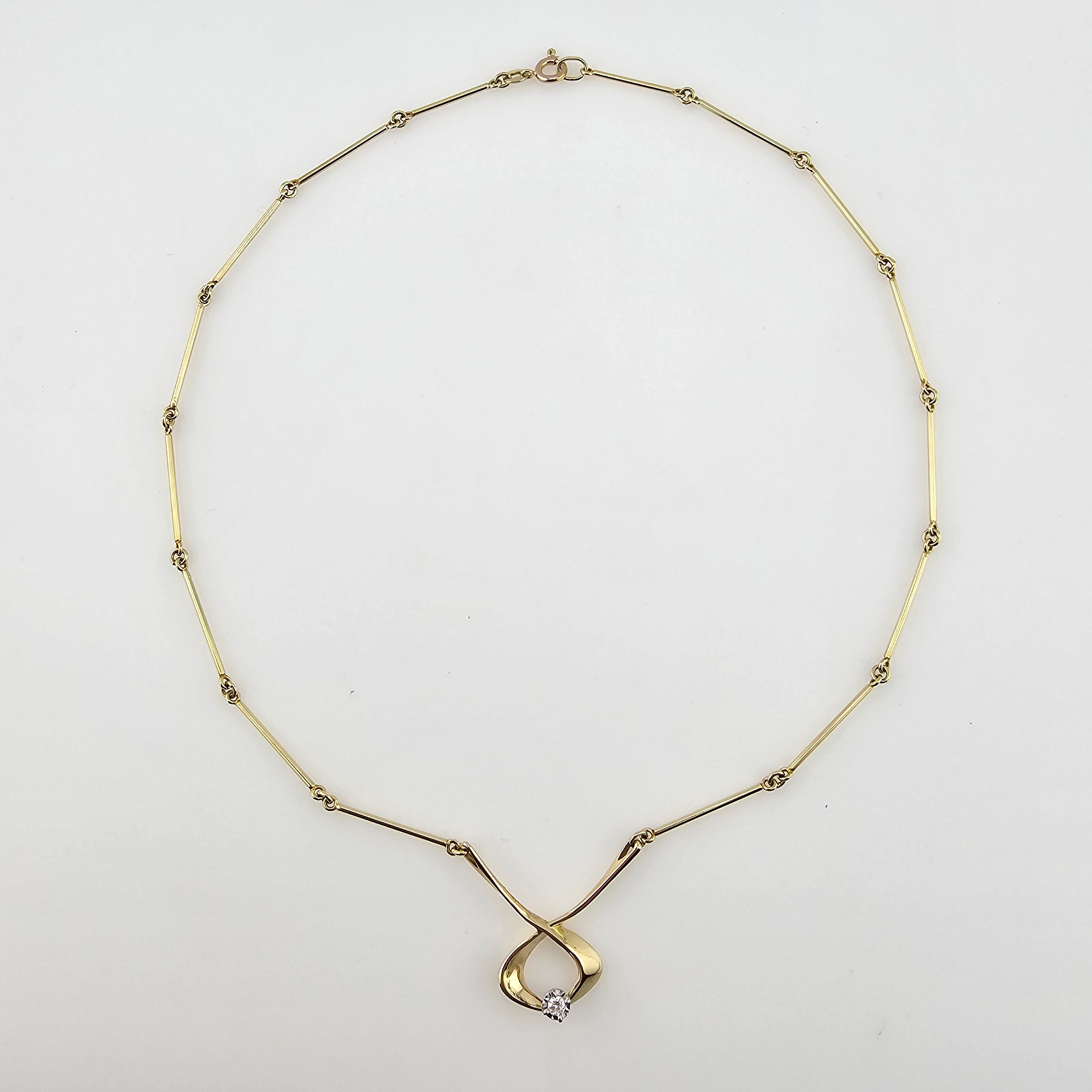 Delicately crafted from 14k yellow gold, this enchanting diamond necklace features a graceful ribbon-like design that tenderly cradles a sparkling 0.07-carat round cut diamond. Its subtle shimmer brings a touch of magic to any ensemble, making it a timeless treasure from the Westgate Jewelers Estate Collection.