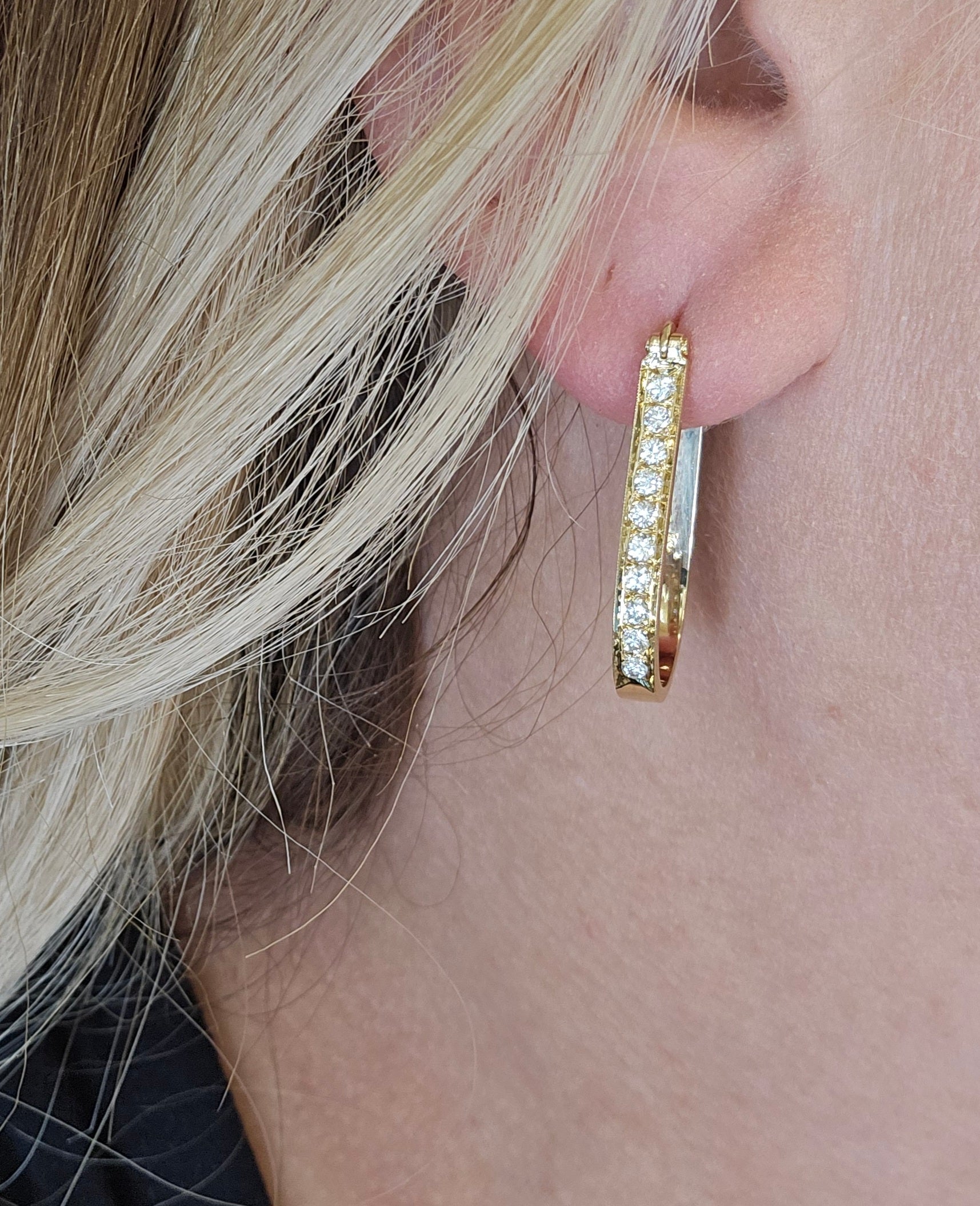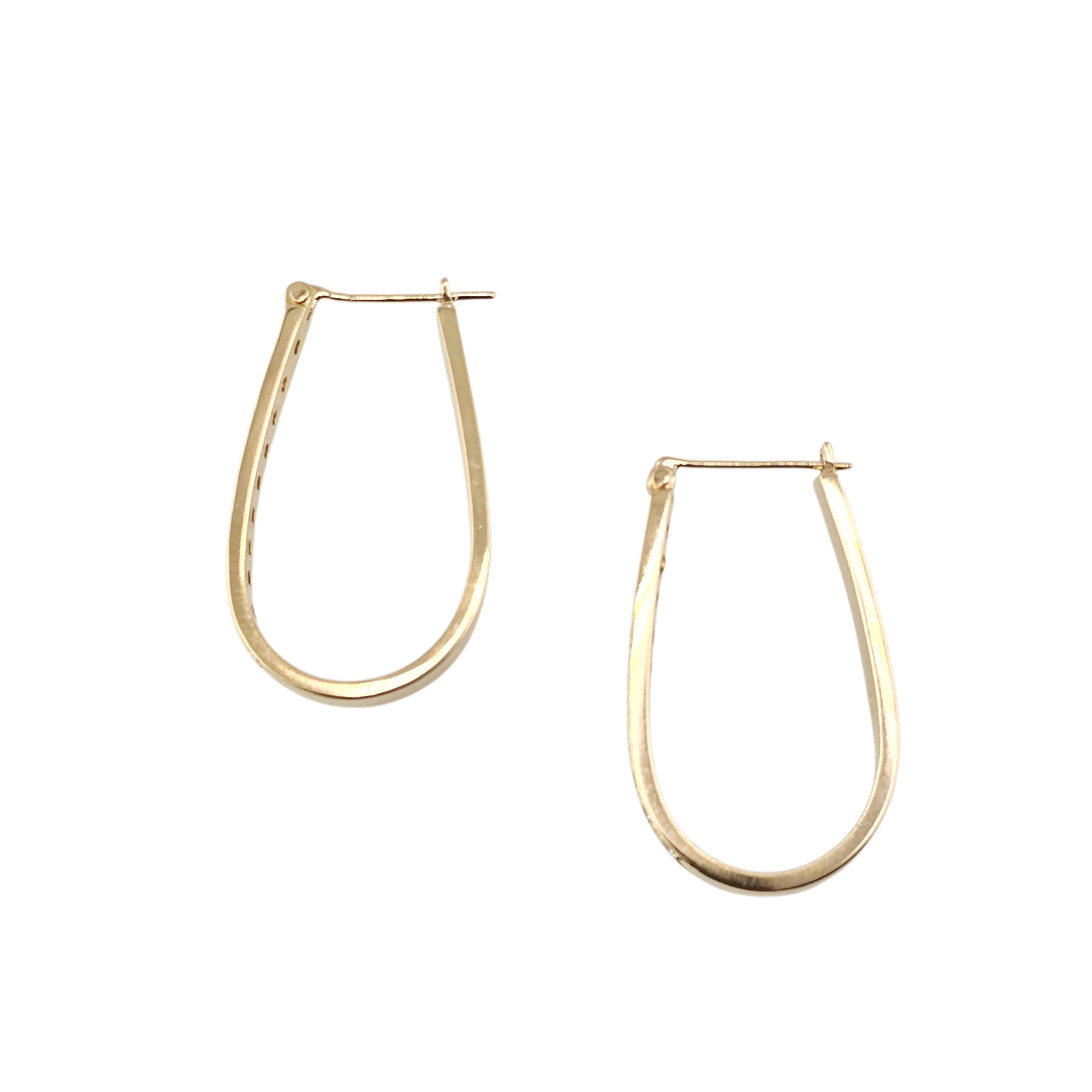 From the Westgate Jewelers Estate Collection, these captivating long oval hoop earrings shimmer with prong-set diamond accents that catch light with an almost ethereal glow. Crafted in 14k yellow gold, the elegant elongated silhouette frames the face beautifully while the sparkling diamonds add a touch of timeless sophistication. Perfect for those who appreciate jewelry that whispers of classic elegance and enduring charm. A versatile piece that transitions effortlessly from everyday wear to special occasions, these hoops are a treasure worth cherishing.