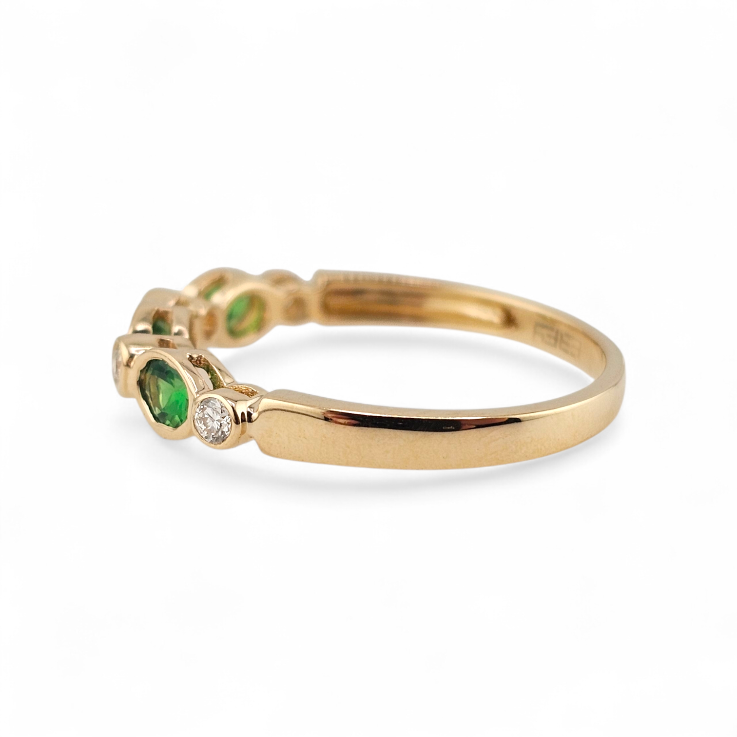 This Estate Collection ring weaves together an enchanting tapestry of deep green tsavorites and brilliant diamonds in a mesmerizing alternating design. Fashioned in 14k yellow gold and sized at 8, the 0.51 carat composition creates an almost mystical interplay of color and light. The verdant gemstones seem to hold ancient secrets while the diamonds sparkle with ethereal brilliance—a harmonious dance of contrasts that feels both timeless and touched by magic. An heirloom-quality piece for the discerning collector.