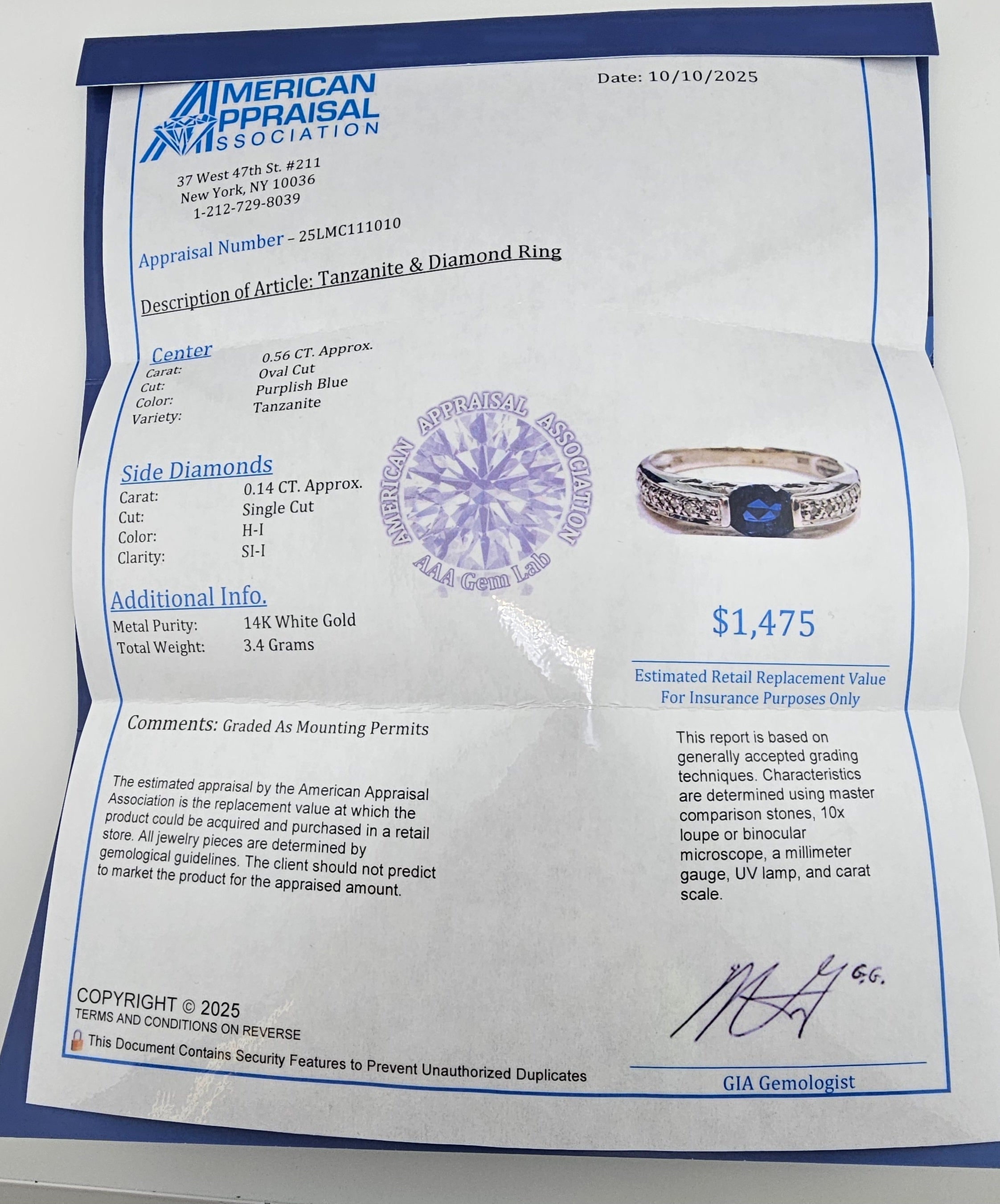 0.56 CT. Tanzanite and Diamond Ring 14k White Gold - Size 9