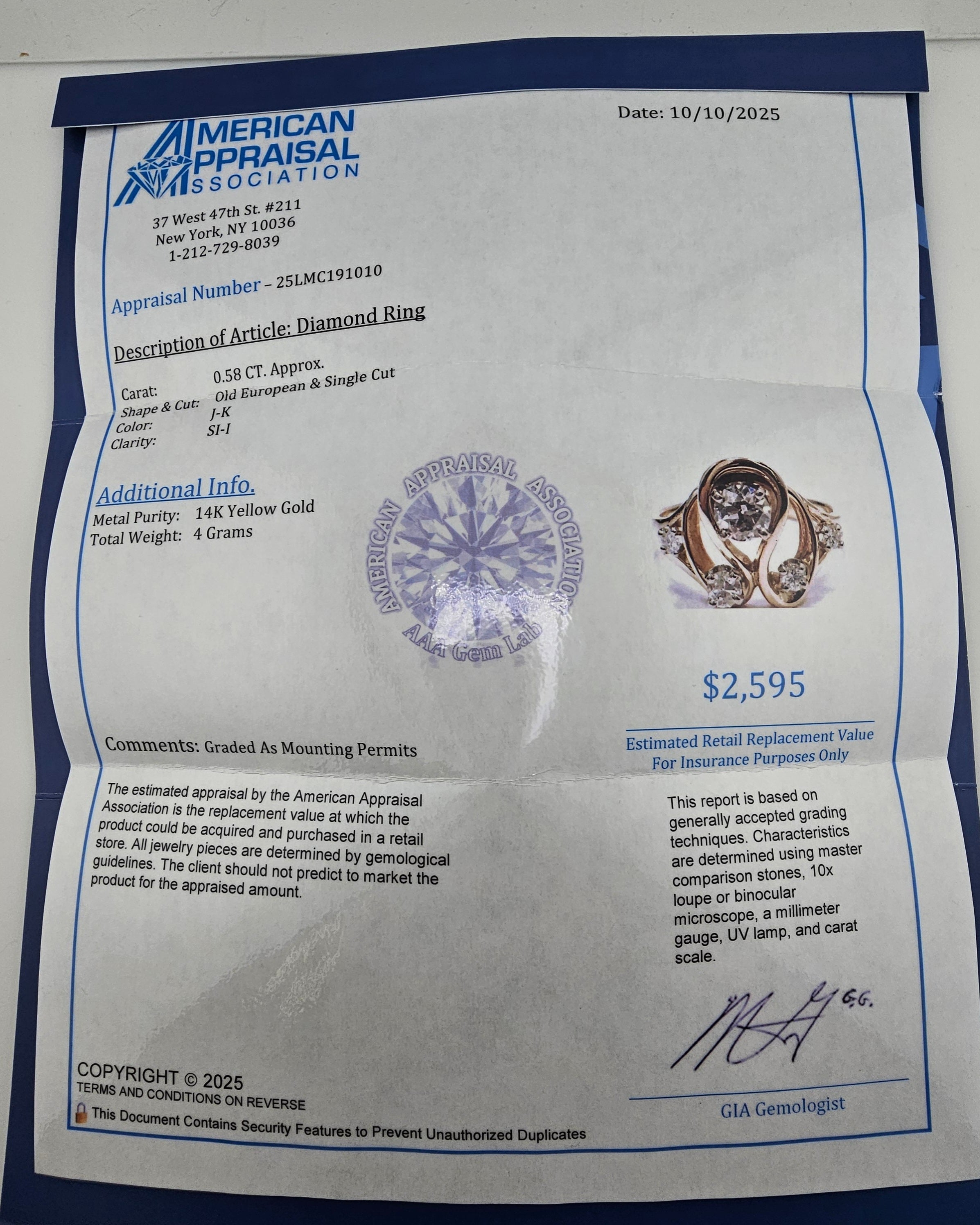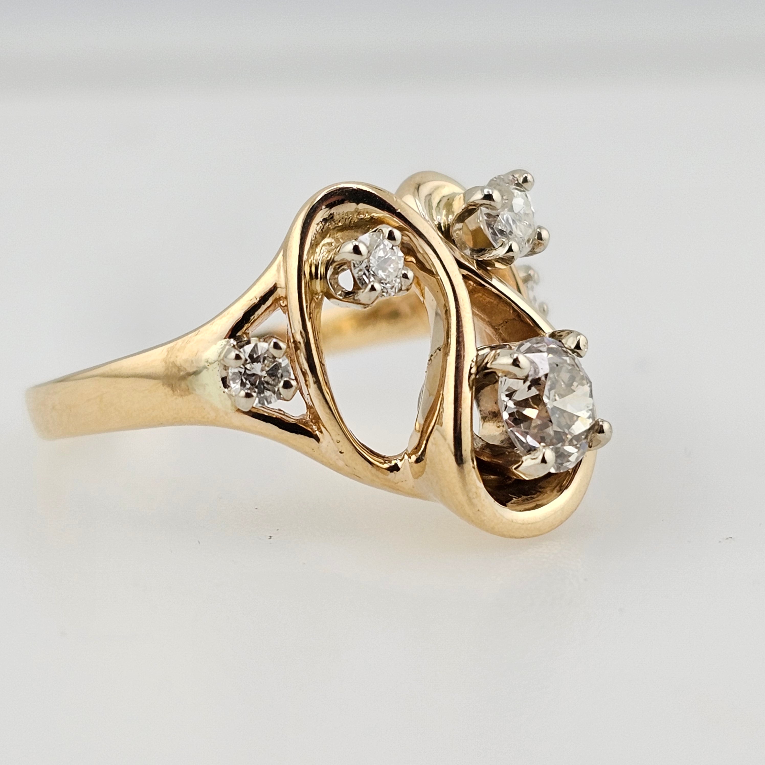 From the Westgate Jewelers Estate Collection comes this captivating 0.58CTW Old European Cut Diamond Ring in radiant 14k yellow gold. Its swirling design gracefully weaves around sparkling diamonds, casting an enchanting glow that feels timeless and magical. Perfectly sized at 5.5, this ring invites you to embrace a touch of vintage charm and luminous elegance that whispers stories of beauty and wonder.