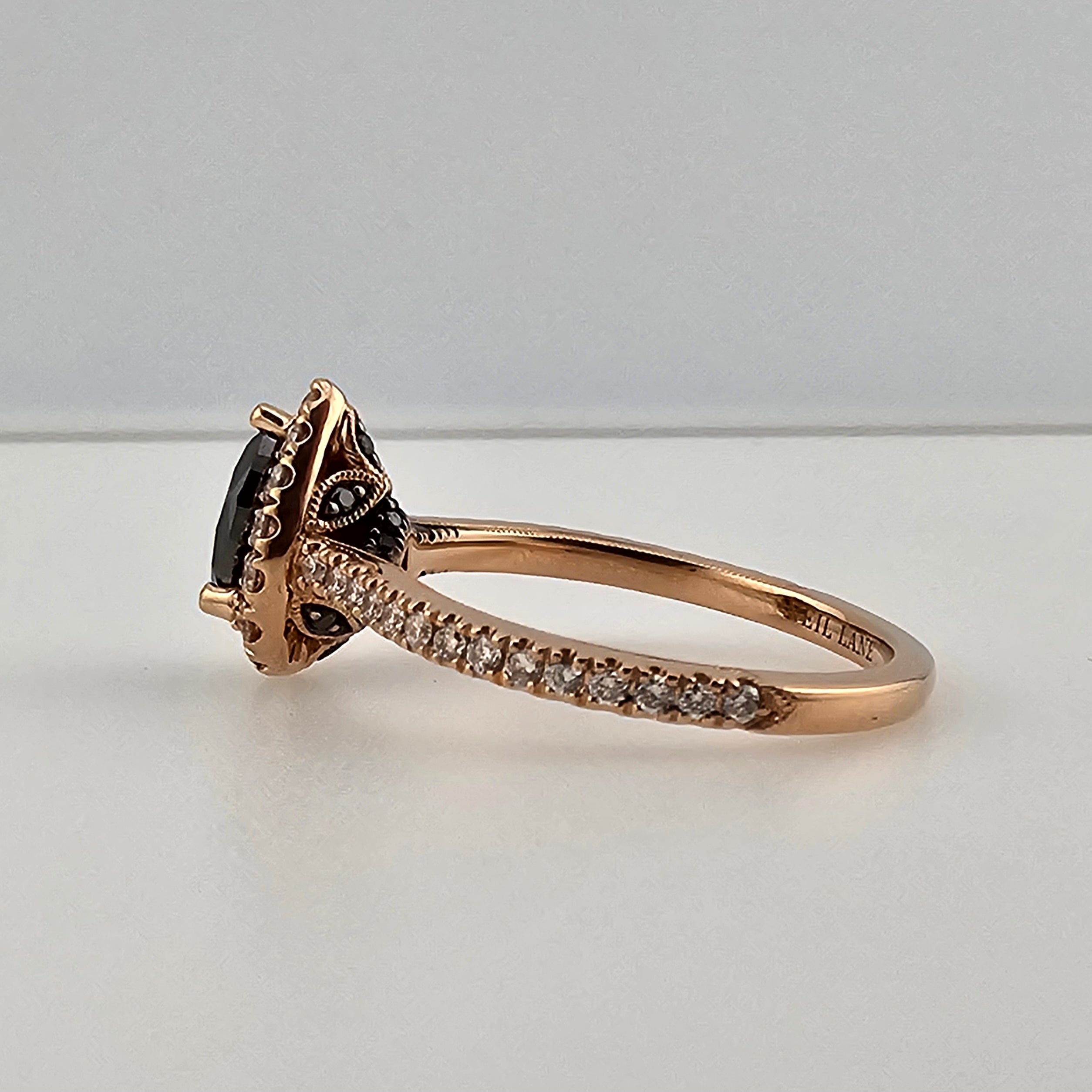 Discover the captivating allure of this 0.72ct pear cut black diamond engagement ring from Westgate Jewelers Estate Collection. Set in warm 14k rose gold, the striking black diamond is embraced by a shimmering halo, radiating a mysterious and enchanting glow. This ring blends timeless elegance with a touch of magic, making it a truly unforgettable symbol of love and devotion.