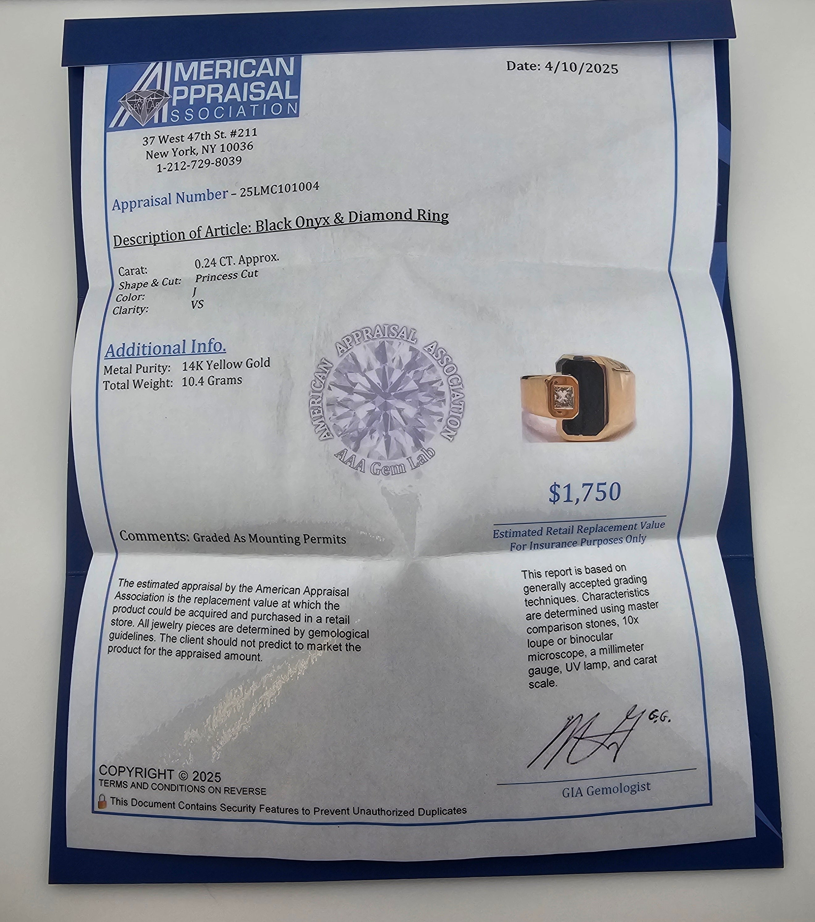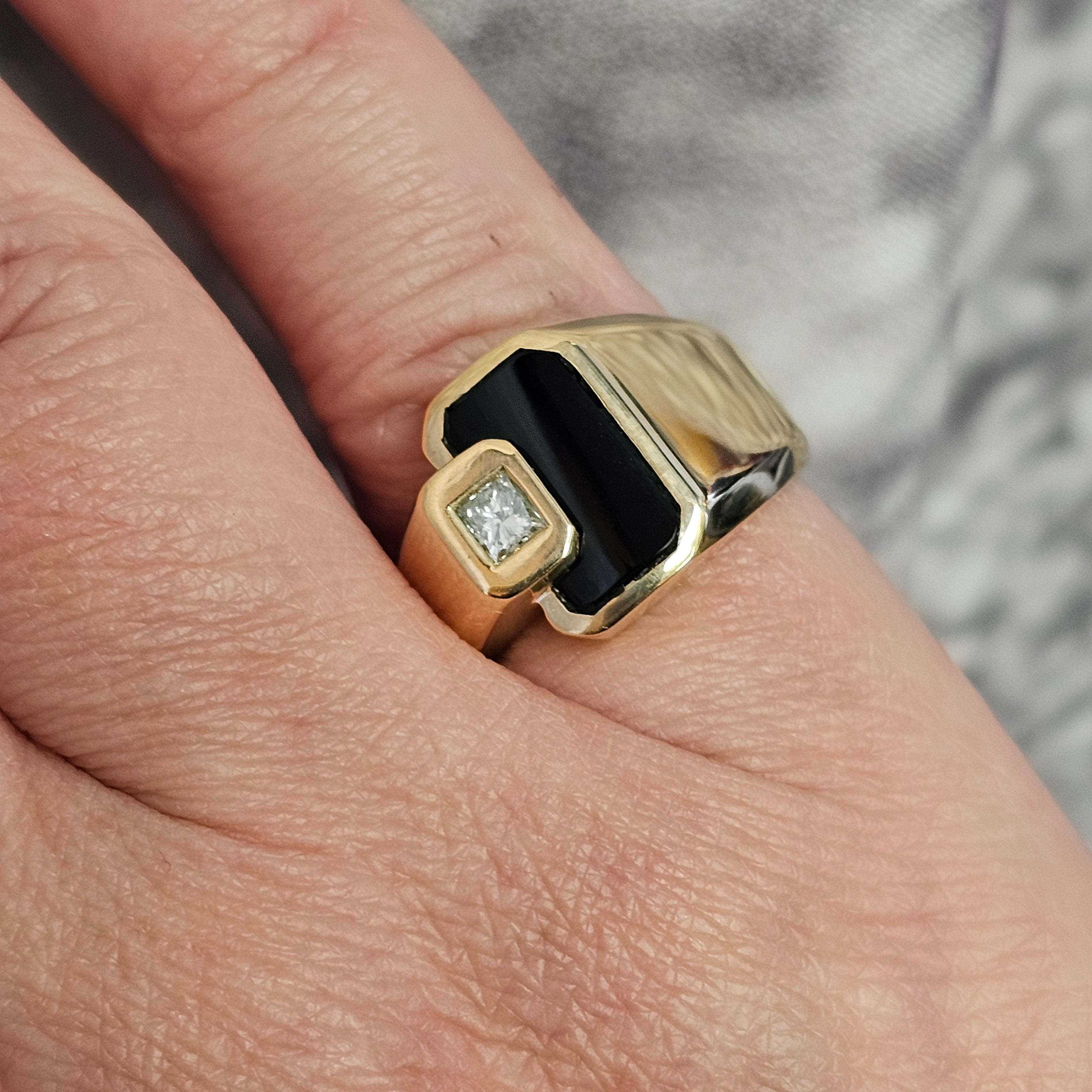 Discover a captivating treasure from the Westgate Jewelers Estate Collection: a 14k yellow gold ring featuring a bold geometric black onyx centerpiece. This enchanting piece is accented by a sparkling princess cut diamond, adding a touch of magical brilliance. This ring combines mystery and elegance, making it a unique charm for any collection.